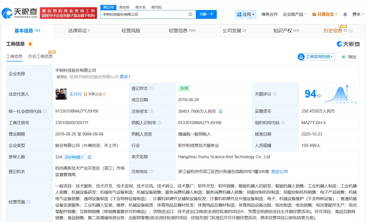 雷达财经讯,天眼查法律诉讼信息显示,近日,杭州宇树科技股份有限公司及邵某新增1条开庭公告,原告为孙某,涉及侵权责任纠纷案件,该案将于2026年1月6日在杭州市滨江区人民法院开庭审理。