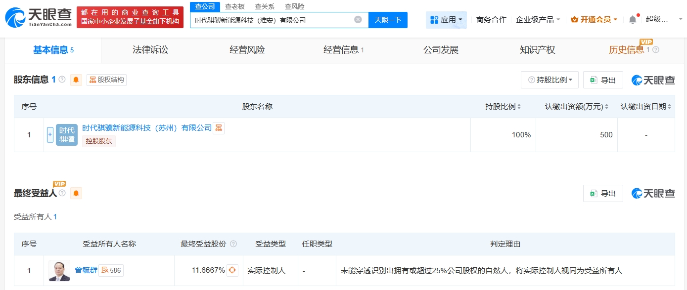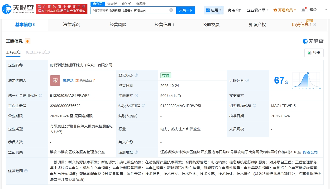 雷达财经讯,天眼查App显示,近日,时代骐骥新能源科技(淮安)有限公司成立,法定代表人为宋庆龙,注册资本500万人民币,经营范围包括新兴能源技术研发、新能源汽车换电设施销售、在线能源计量技术研发、合同能源管理、电池销售等。股东信息显示,该公司由宁德时代旗下时代骐骥新能源科技(苏州)有限公司全资持股。