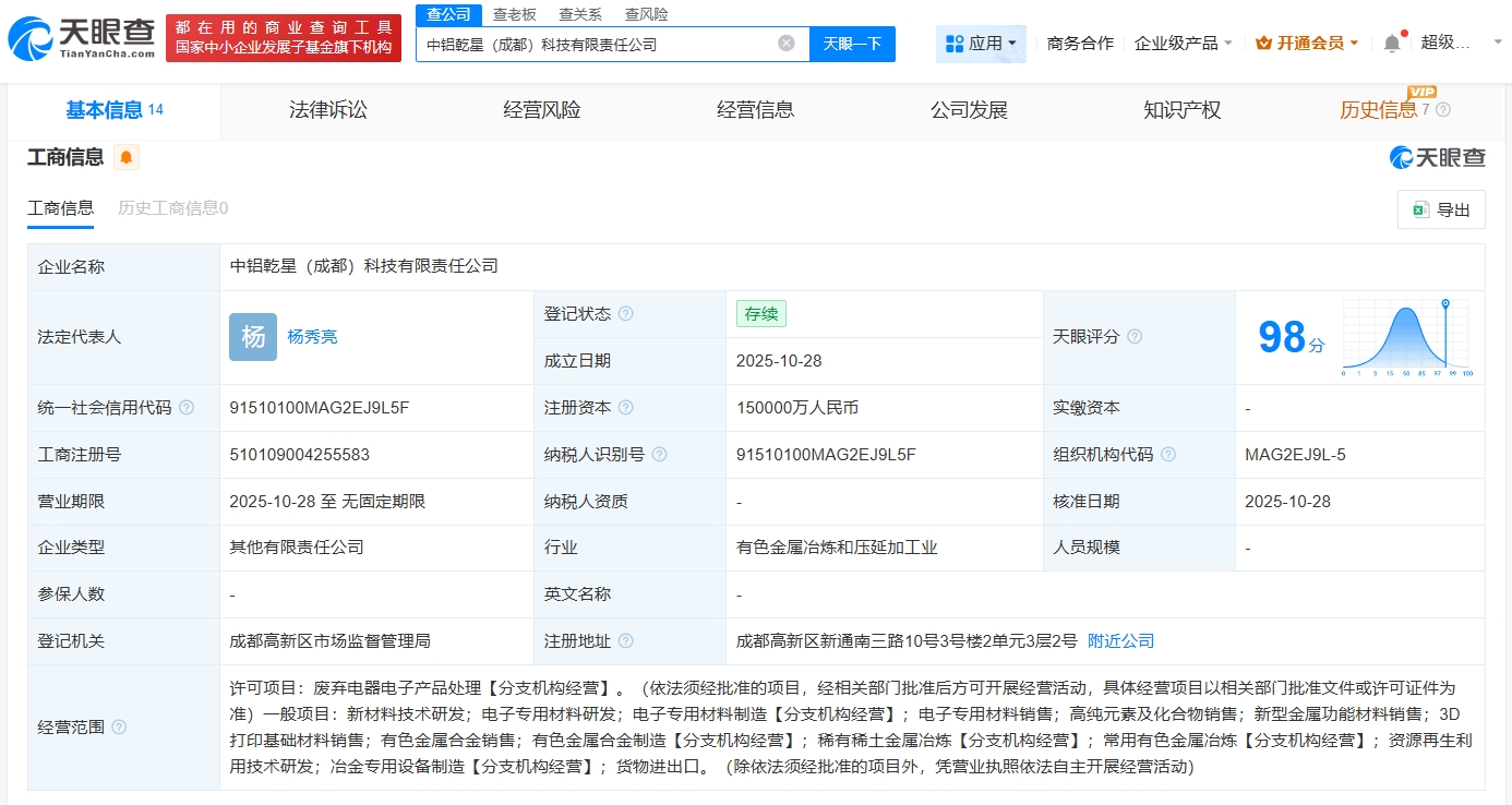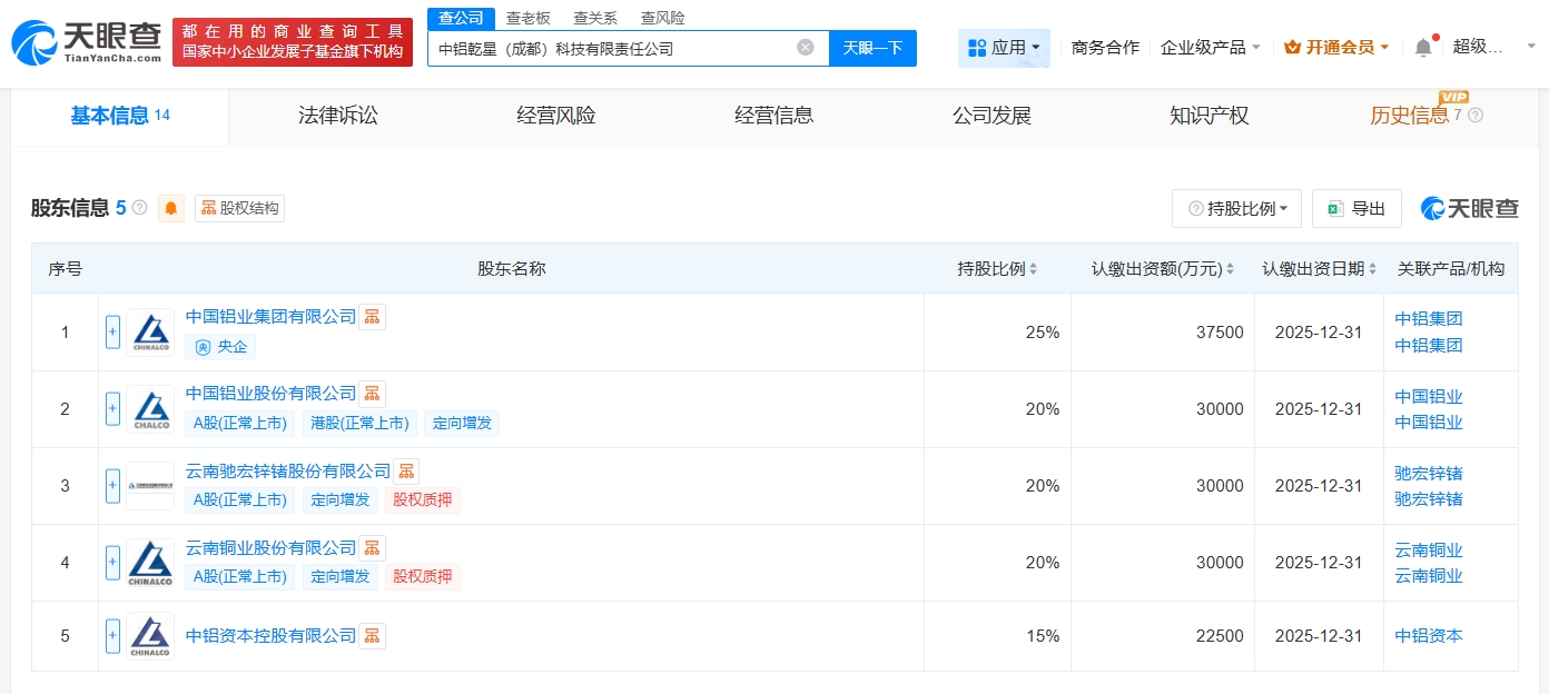 雷达财经讯,天眼查App显示,近日,中铝乾星(成都)科技有限责任公司成立,法定代表人为杨秀亮,注册资本15亿人民币,经营范围包括新材料技术研发、电子专用材料研发、电子专用材料制造等。股东信息显示,该公司由中国铝业集团有限公司、驰宏锌锗(600497)、云南铜业(000878)等共同持股。
