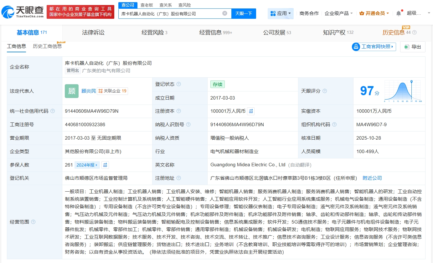 雷达财经讯,天眼查App显示,近日,广东美的电气有限公司发生工商变更,企业名称变更为库卡机器人自动化(广东)股份有限公司,同时经营范围及部分高管发生变更。