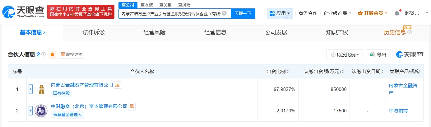 雷达财经讯,天眼查App显示,近日,内蒙古培育重点产业引导基金股权投资合伙企业(有限合伙)成立,执行事务合伙人为中财融商(北京)资本管理有限公司,出资额86.75亿人民币,经营范围包括以私募基金从事股权投资、投资管理、资产管理等活动。合伙人信息显示,该基金由内蒙古金融资产管理有限公司、中财融商(北京)资本管理有限公司共同出资。
