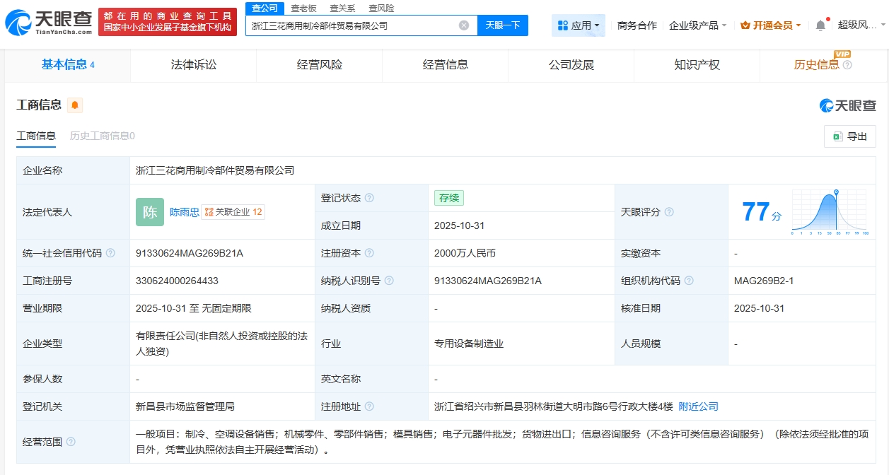 雷达财经讯,天眼查App显示,近日,浙江三花商用制冷部件贸易有限公司成立,法定代表人为陈雨忠,注册资本2000万人民币,经营范围包括冷、空调设备销售,机械零件、零部件销售,模具销售等。股权全景穿透图显示,该公司由三花智控(002050)旗下浙江三花商用制冷有限公司全资持股。