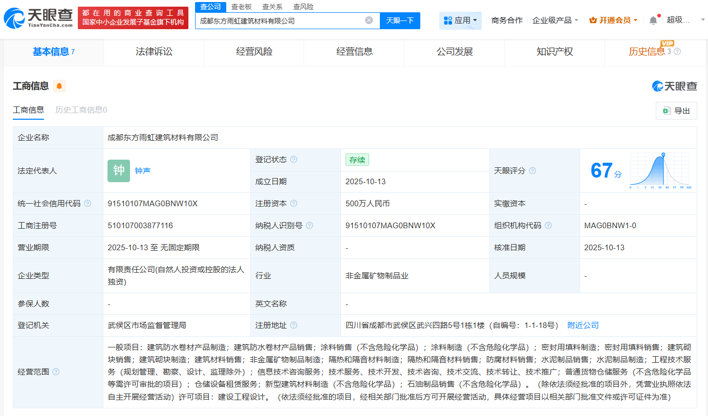 东方雨虹在成都成立建筑材料公司 注册资本500万