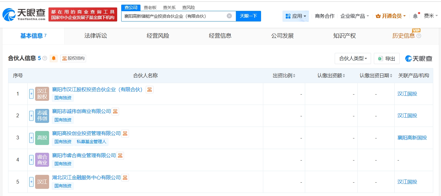 雷达财经讯,天眼查App显示,近日,襄阳高新储能产业投资合伙企业(有限合伙)成立,执行事务合伙人为襄阳高投创业投资管理有限公司,出资额50.05亿人民币,经营范围为以自有资金从事投资活动,由襄阳市汉江股权投资合伙企业(有限合伙)、襄阳志诚伟创商业有限公司、襄阳高投创业投资管理有限公司等共同出资。