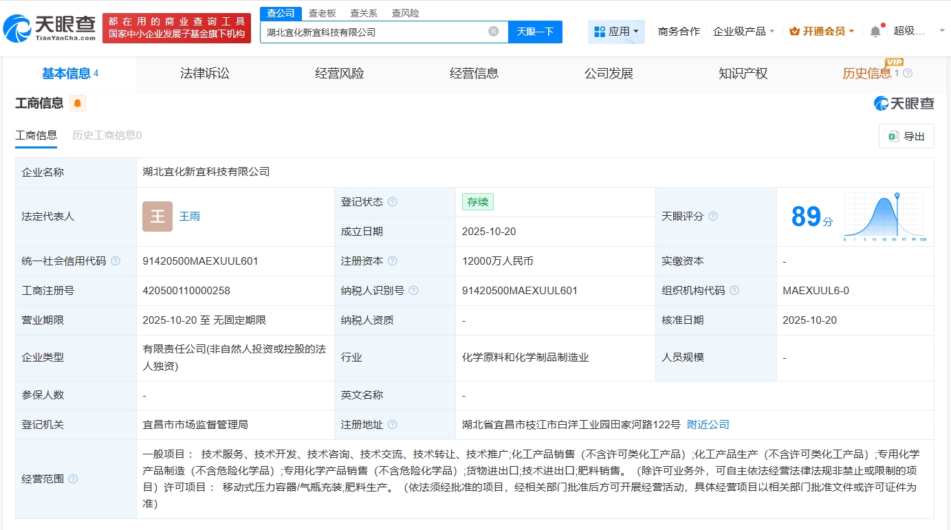 雷达财经讯,天眼查App显示,近日,湖北宜化新宜科技有限公司成立,法定代表人为王雨,注册资本1.2亿人民币,经营范围包括化工产品销售、化工产品生产、货物进出口、肥料销售等。股东信息显示,该公司由湖北宜化(000422)全资持股。