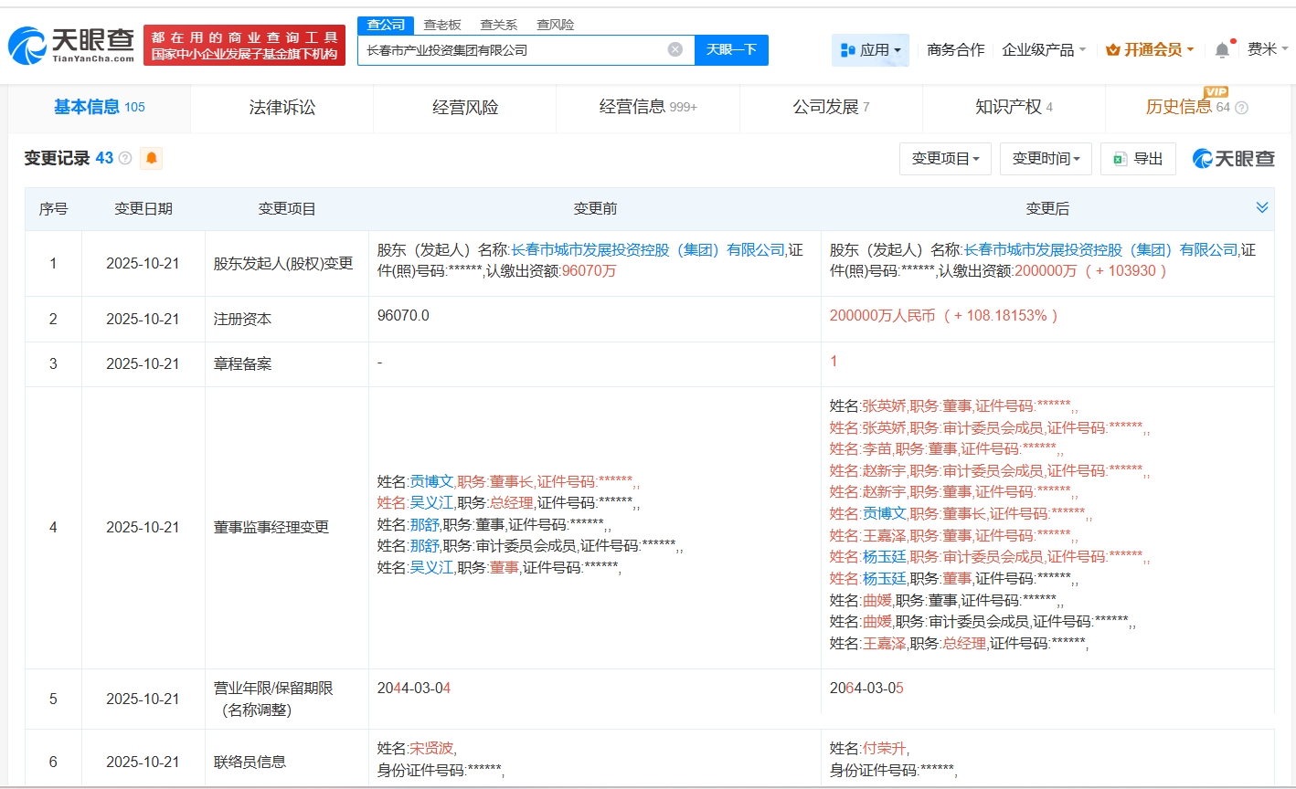 雷达财经讯,天眼查App显示,近日,长春市产业投资集团有限公司发生工商变更,注册资本由约9.61亿增至20亿人民币,增幅约108%,同时发生高管变更。