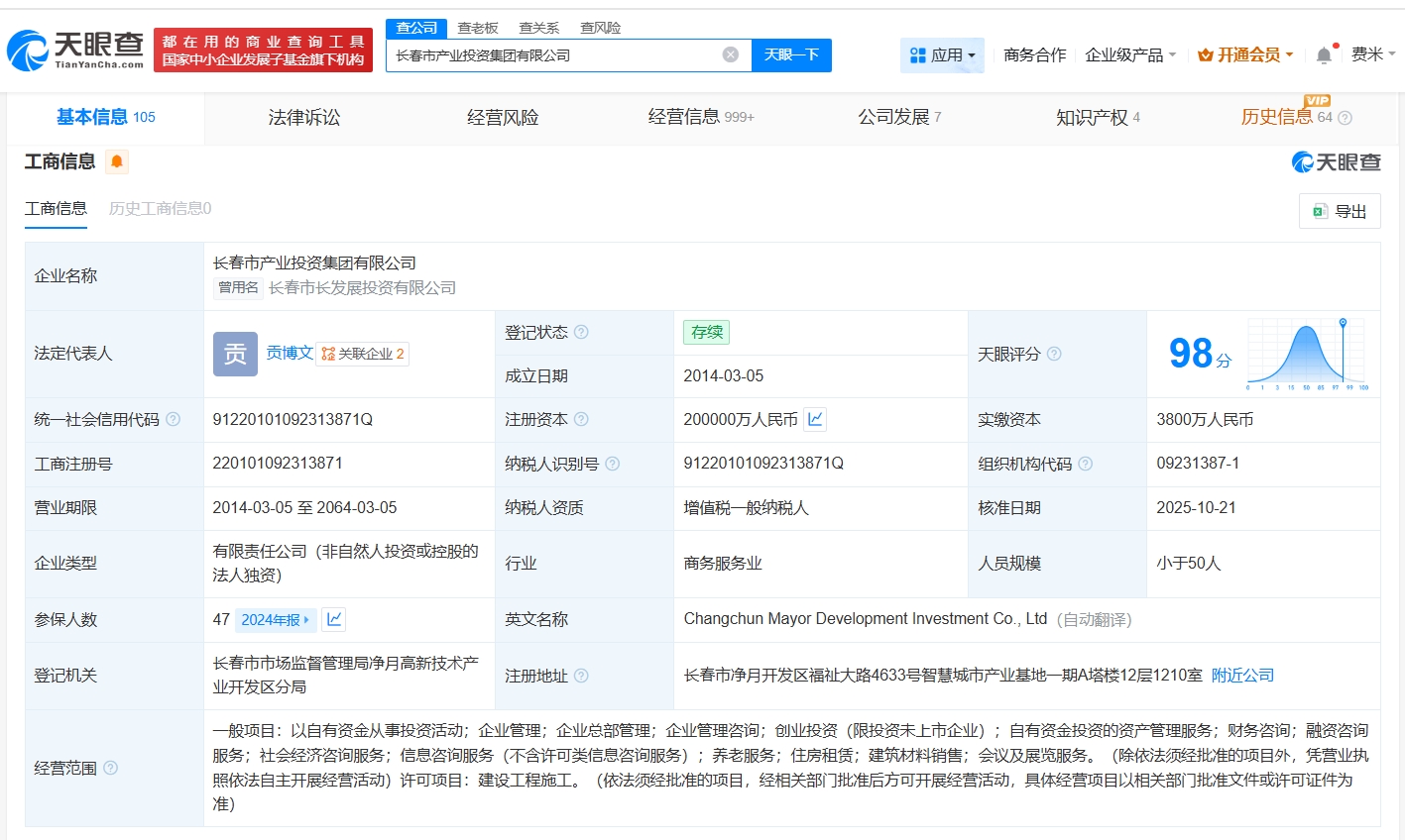 长春市产业投资集团有限公司成立于2014年3月,法定代表人为贡博文,经营范围包括以自有资金从事投资活动、企业管理、创业投资等。股东信息显示,该公司由长春市城市发展投资控股(集团)有限公司全资持股。