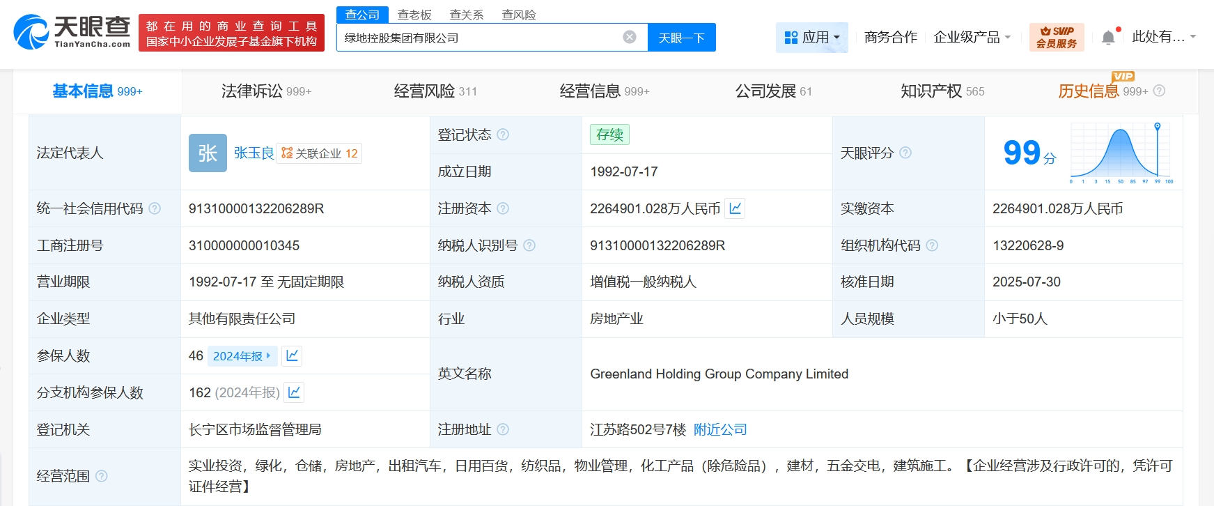 绿地控股集团有限公司成立于1992年7月,法定代表人为张玉良,注册资本约226.5亿人民币,经营范围含实业投资,绿化,仓储,房地产等。股东信息显示,该公司由绿地控股(600606)、绿地金创科技集团有限公司共同持股。天眼风险信息显示,该公司现存23条被执行人信息,被执行总金额超56亿元,此外,该公司还存在多条限制消费令、失信被执行人(老赖)及终本案件信息。