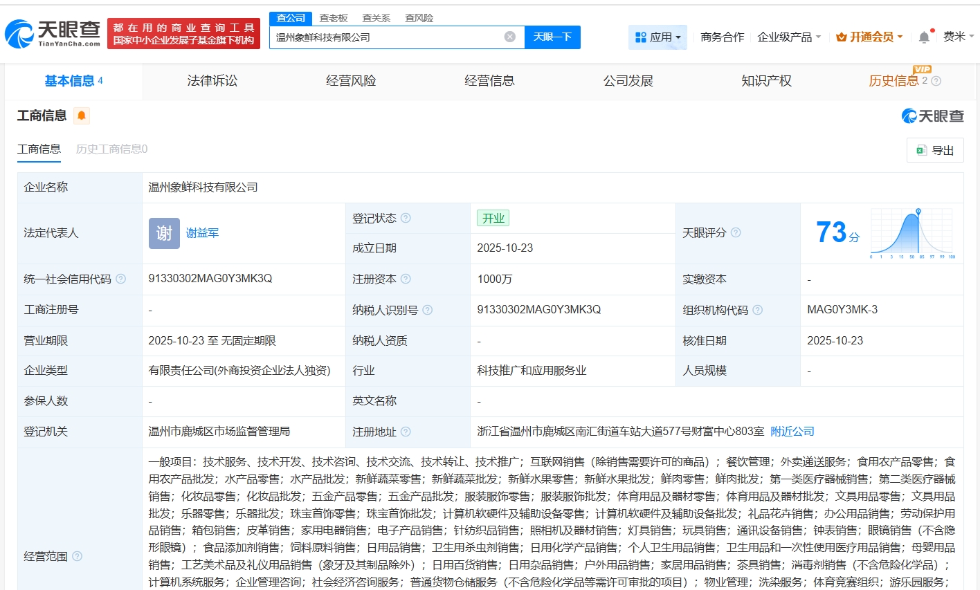 雷达财经讯,天眼查App显示,10月23日,温州象鲜科技有限公司成立,法定代表人为谢益军,注册资本1000万人民币,经营范围包括互联网销售、餐饮管理、外卖递送服务等,由小象超市关联公司北京象鲜科技有限公司全资持股。