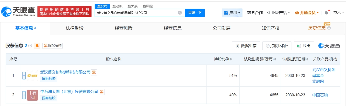 雷达财经讯,天眼查App显示,近日,武汉首义昆仑新能源有限责任公司成立,法定代表人为雷凯,注册资本9500万人民币,经营范围包括储能技术服务、新能源汽车换电设施销售、石油制品销售等。股东信息显示,该公司由武汉首义新能源科技有限公司、中国石油(601857)旗下中石油太湖(北京)投资有限公司共同持股。