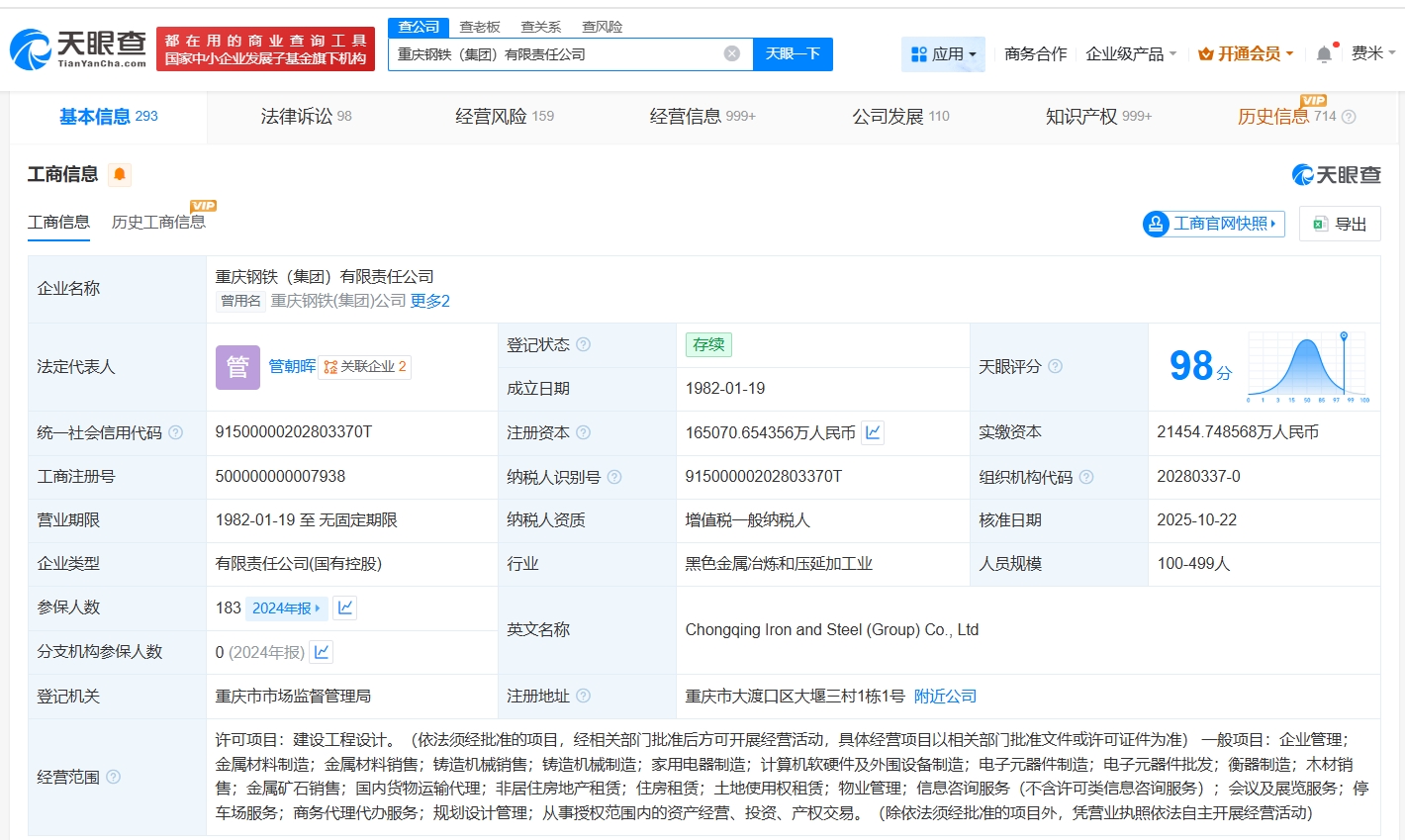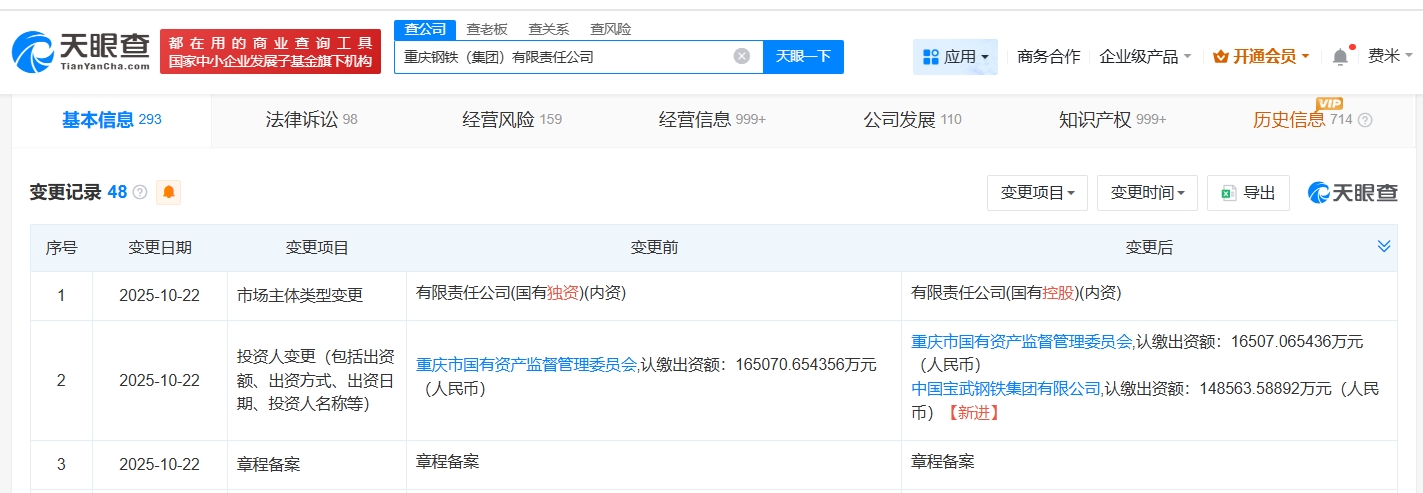 雷达财经讯,天眼查App显示,近日,重庆钢铁(集团)有限责任公司发生工商变更,新增中国宝武钢铁集团有限公司为股东。