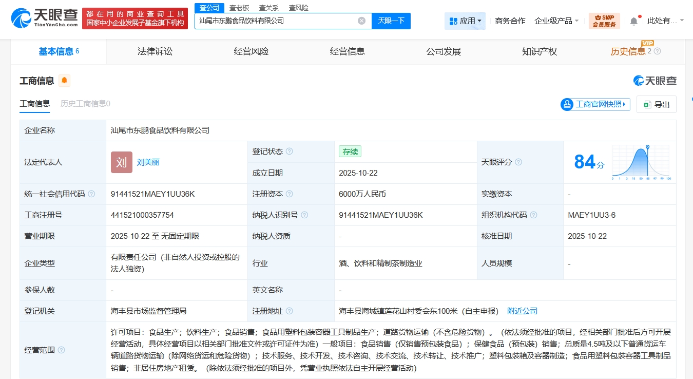 雷达财经讯,天眼查工商信息显示,近日,汕尾市东鹏食品饮料有限公司成立,法定代表人为刘美丽,注册资本6000万人民币,经营范围含食品生产、饮料生产、食品销售、食品用塑料包装容器工具制品生产、道路货物运输、保健食品销售、非居住房地产租赁等。股东信息显示,该公司由东鹏饮料(605499)全资持股。