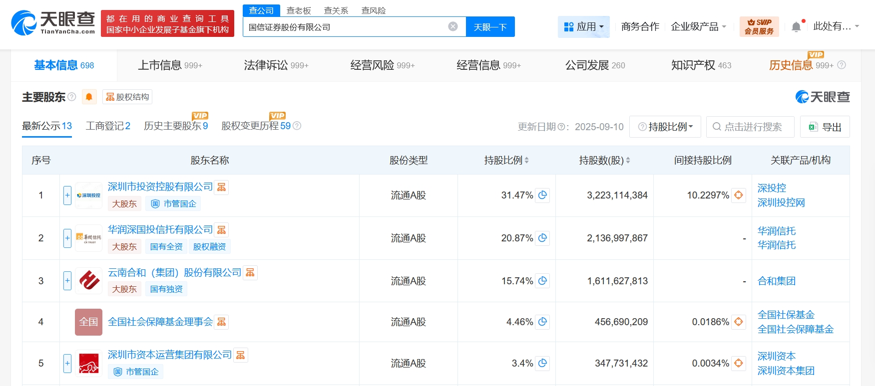 国信证券股份有限公司1994年6月,法定代表人为张纳沙,经营范围含证券经纪,证券投资咨询,与证券交易、证券投资活动有关的财务顾问,证券承销与保荐,证券自营,融资融券等。股东信息显示,该公司由深圳市投资控股有限公司、华润深国投信托有限公司、云南合和(集团)股份有限公司等共同持股。