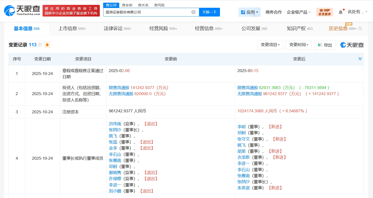 雷达财经讯,天眼查App显示,近日,国信证券(002736)发生工商变更,注册资本由约96.1亿人民币增至约102.4亿人民币,增幅约6.5%,同时,多位高管均发生变更。