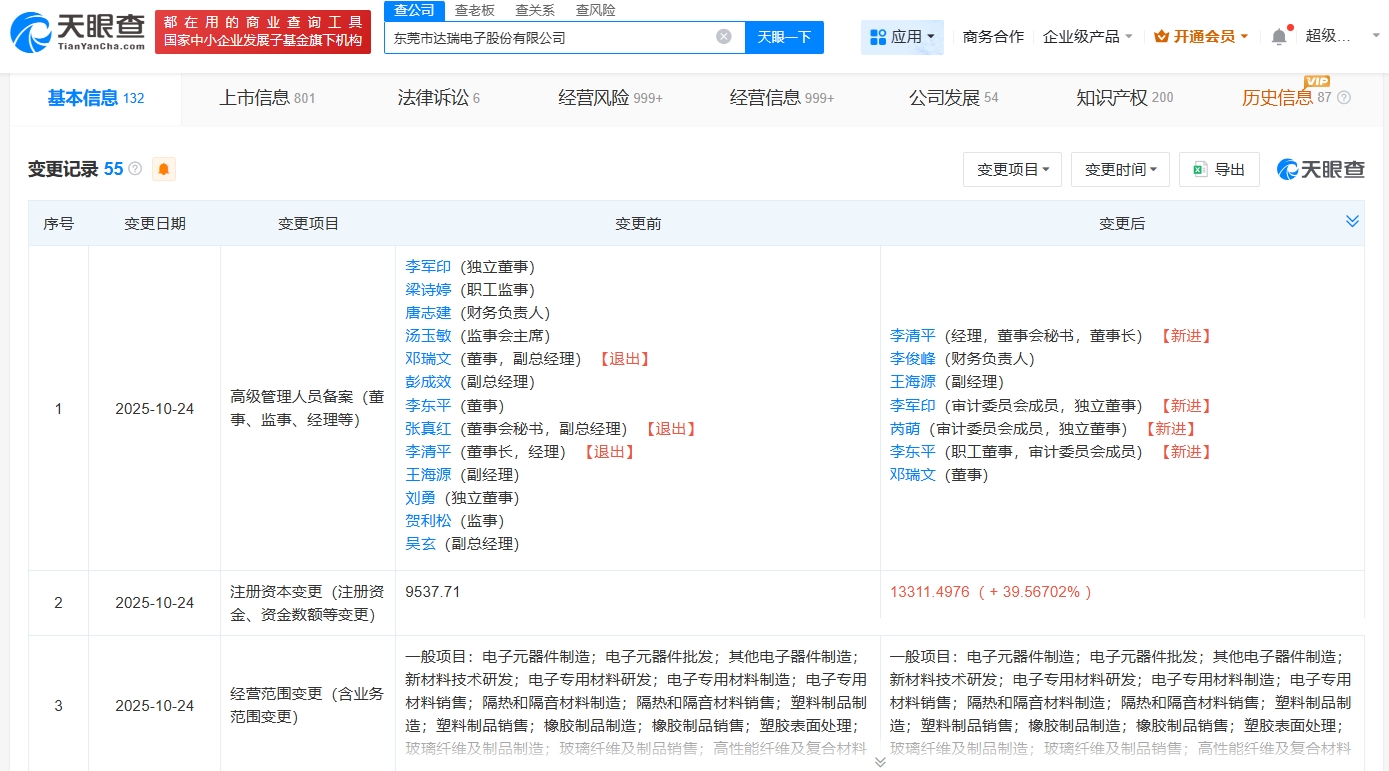 雷达财经讯,天眼查App显示,近日,达瑞电子(300976)发生工商变更,注册资本由9537.71万人民币增至约1.33亿人民币,增幅约39.6%,同时多位高管发生变更。