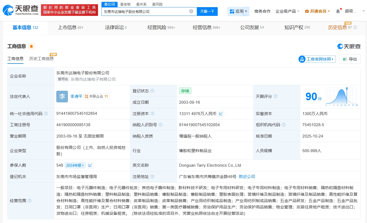 东莞市达瑞电子股份有限公司成立于2003年9月,法定代表人为李清平,经营范围包括电子元器件制造、电子元器件批发、其他电子器件制造、新材料技术研发等。股东信息显示,该公司由李清平、李东平等共同持股。