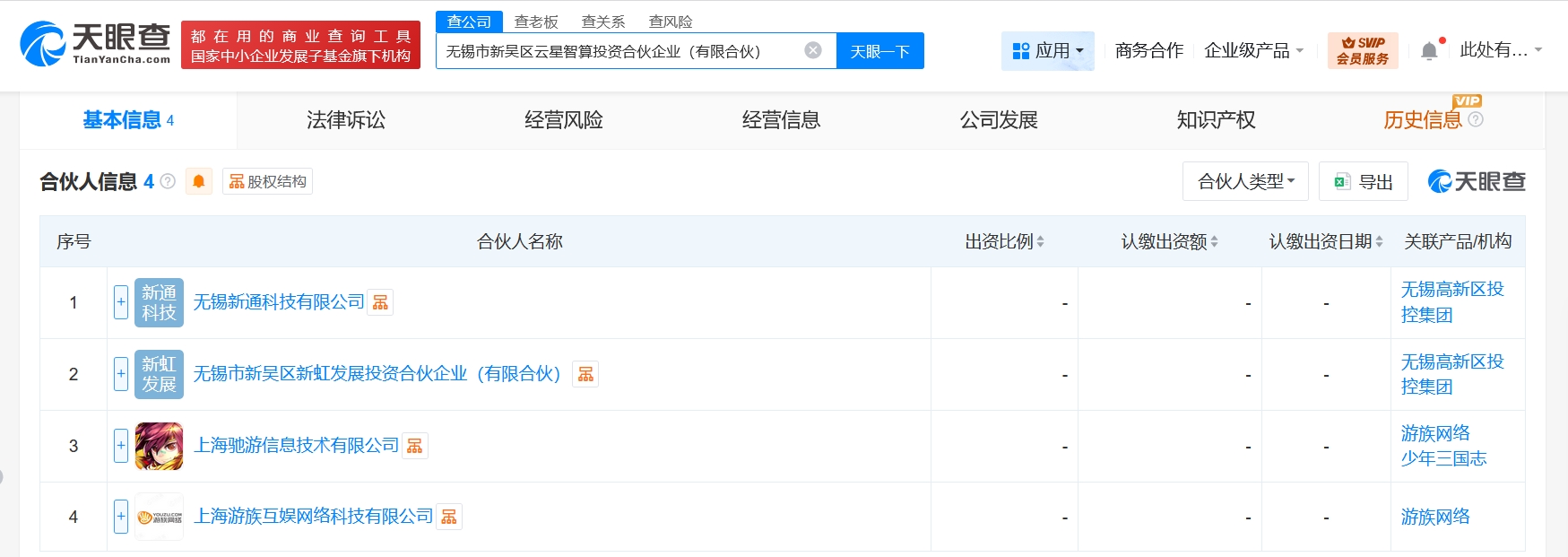 雷达财经讯,天眼查工商信息显示,近日,无锡市新吴区云星智算投资合伙企业(有限合伙)成立,执行事务合伙人为无锡新通科技有限公司,出资额约66.7亿人民币,经营范围为以自有资金从事投资活动。合伙人信息显示,该合伙企业由无锡新通科技有限公司、无锡市新吴区新虹发展投资合伙企业(有限合伙)、上海驰游信息技术有限公司、上海游族互娱网络科技有限公司共同出资。