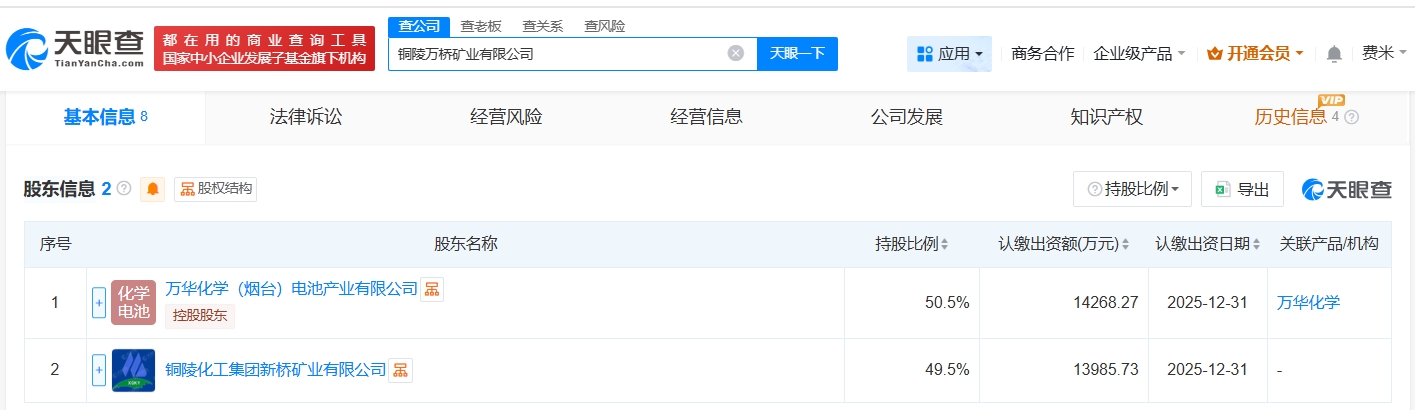 雷达财经讯,天眼查App显示,近日,铜陵万桥矿业有限公司成立,法定代表人为王晓星,注册资本约2.8亿人民币,经营范围包括金属矿石销售、金属材料销售、以自有资金从事投资活动等,由万华化学(600309)旗下万华化学(烟台)电池产业有限公司、铜陵化工集团新桥矿业有限公司共同持股。