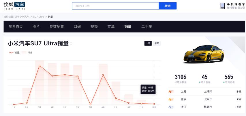 但从去年9月开始,SU7 Ultra的销量骤降至三位数,仅488辆。临近年末的12月,其月销量更是进一步跌至两位数。