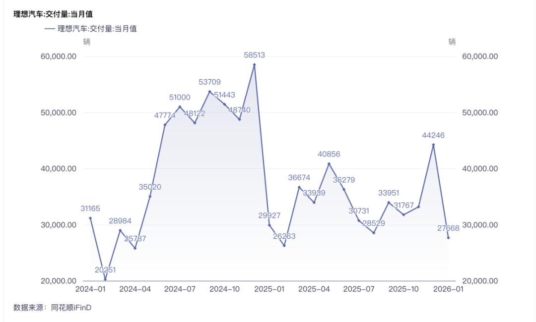 2025年,理想汽车全年交付约40.6万辆汽车,较2024年下滑18.8%。而在刚刚过去的1月,理想汽车单月交付约2.8万辆汽车,同比下滑7.5%。
