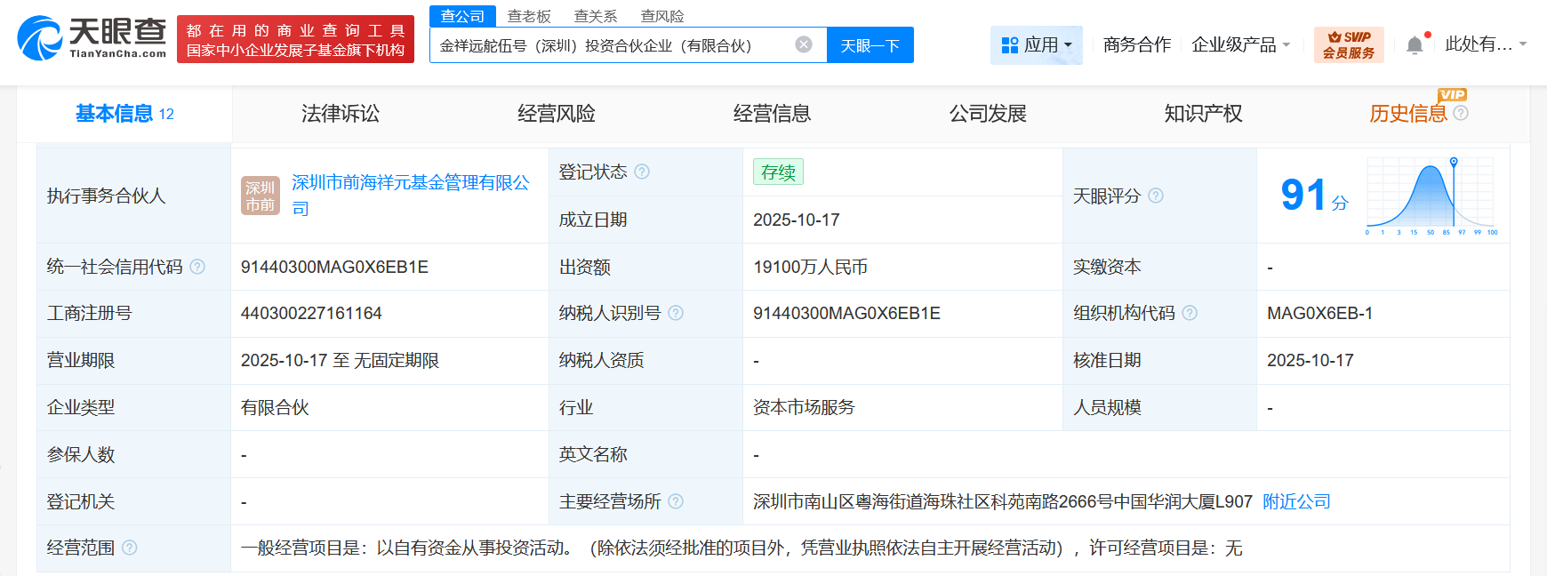 雷达财经讯,天眼查工商信息显示,近日,金祥远舵伍号(深圳)投资合伙企业(有限合伙)成立,执行事务合伙人为深圳市前海祥元基金管理有限公司,出资额1.91亿人民币,经营范围为以自有资金从事投资活动。合伙人信息显示,该企业由泸州老窖集团旗下四川金舵投资有限责任公司以及珠海祥元叁号投资合伙企业(有限合伙)、深圳市前海祥元基金管理有限公司共同出资。