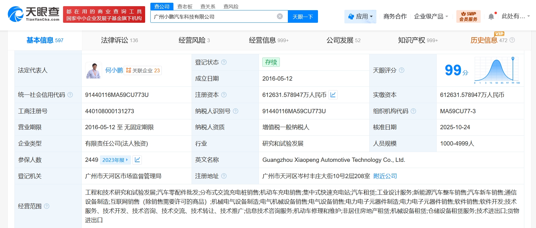 该公司成立于2016年5月,法定代表人为何小鹏,注册资本约61.26亿人民币,经营范围含工程和技术研究和试验发展、汽车零配件批发、分布式交流充电桩销售、机动车充电销售、集中式快速充电站、汽车租赁、工业设计服务等。股东信息显示,该公司由广州橙行智动汽车科技有限公司全资持股。任职信息显示,何小鹏名下关联20余家企业,包括广东小鹏汽车科技集团有限公司、肇庆小鹏新能源投资有限公司、广州橙行智动汽车科技有限公司等。