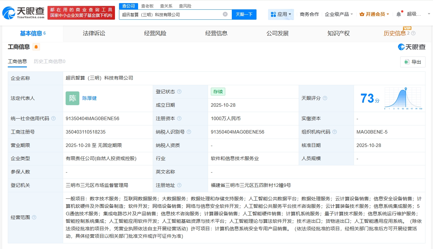 雷达财经讯,天眼查App显示,近日,超讯智算(三明)科技有限公司成立,法定代表人为陈厚健,注册资本1000万人民币,经营范围包括数字技术服务、互联网数据服务、大数据服务、数据处理和存储支持服务、人工智能公共数据平台等。股东信息显示,该公司由超讯通信(603322)、广州云上鸿图投资合伙企业(有限合伙)、广州华汇智算数字信息技术有限公司共同持股。
