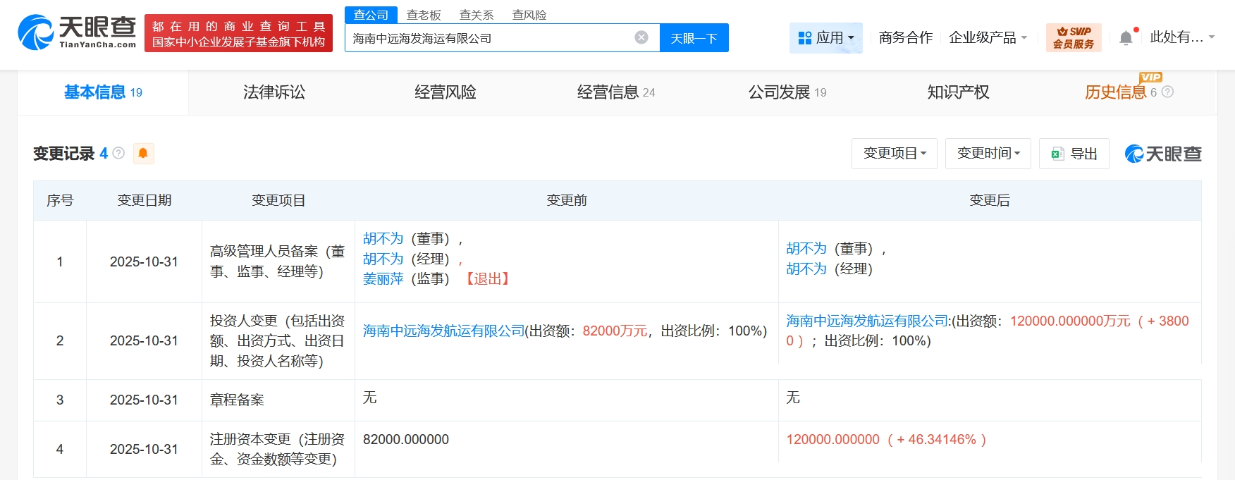 雷达财经讯,天眼查工商信息显示,近日,海南中远海发海运有限公司发生工商变更,注册资本由8.2亿人民币增至12亿人民币,增幅约46%,同时,姜丽萍卸任监事职务。