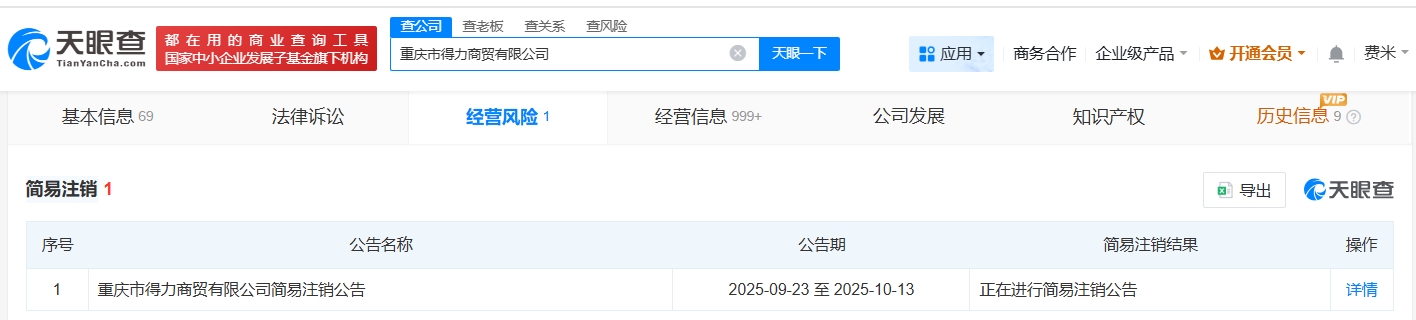 雷达财经讯,天眼查工商信息显示,近日,重庆市得力商贸有限公司登记状态由存续变更为注销。此前,该公司已发布简易注销公告。