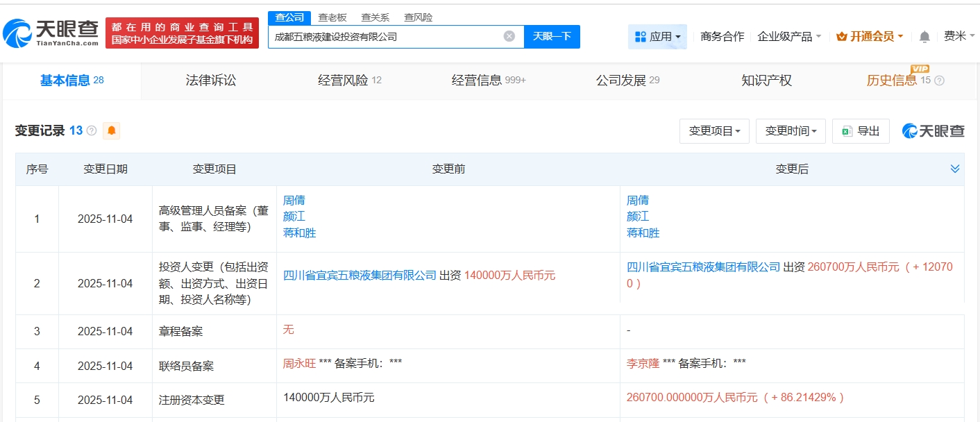 雷达财经讯,天眼查工商信息显示,近日,成都五粮液建设投资有限公司发生工商变更,注册资本由14亿人民币增至26.07亿人民币,增幅约86%。