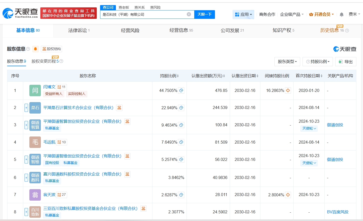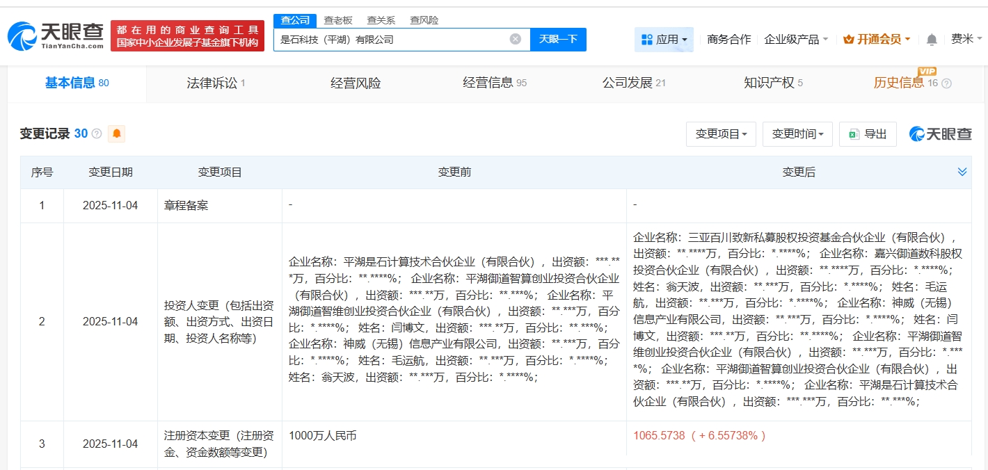 是石科技(平湖)有限公司成立于2020年1月,法定代表人为闫博文,经营范围包括信息技术咨询服务、计算机系统服务、数据处理服务等。股东信息显示,该公司现由闫博文、平湖是石计算技术合伙企业(有限合伙)及上述新增股东等共同持股。公开资料显示,该公司是一家算力服务类企业,业务覆盖AI基础模型研发、航空航天制造、生物医药新材料以及气候气象、新能源等领域。