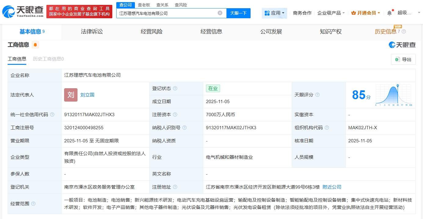 雷达财经讯,天眼查工商信息显示,近日,江苏理想汽车电池有限公司成立,法定代表人为刘立国,注册资本7000万人民币,经营范围包括电池制造、电池销售、新兴能源技术研发、电动汽车充电基础设施运营等。股权全景穿透图显示,该公司由山东理想汽车电池有限公司全资持股,后者由北京理想汽车有限公司、欣旺达动力科技股份有限公司共同持股。