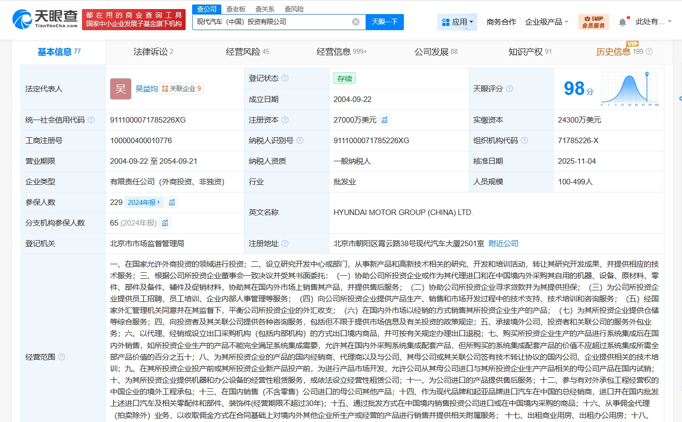 该公司成立于2004年9月,法定代表人为吴益均,经营范围含在国家允许外商投资的领域进行投资,设立研究开发中心或部门,从事新产品和高新技术相关的研究、开发和培训活动,转让其研究开发成果,并提供相应的技术服务等。股东信息显示,该公司由起亚株式会社、现代自动车株式会社共同持股。