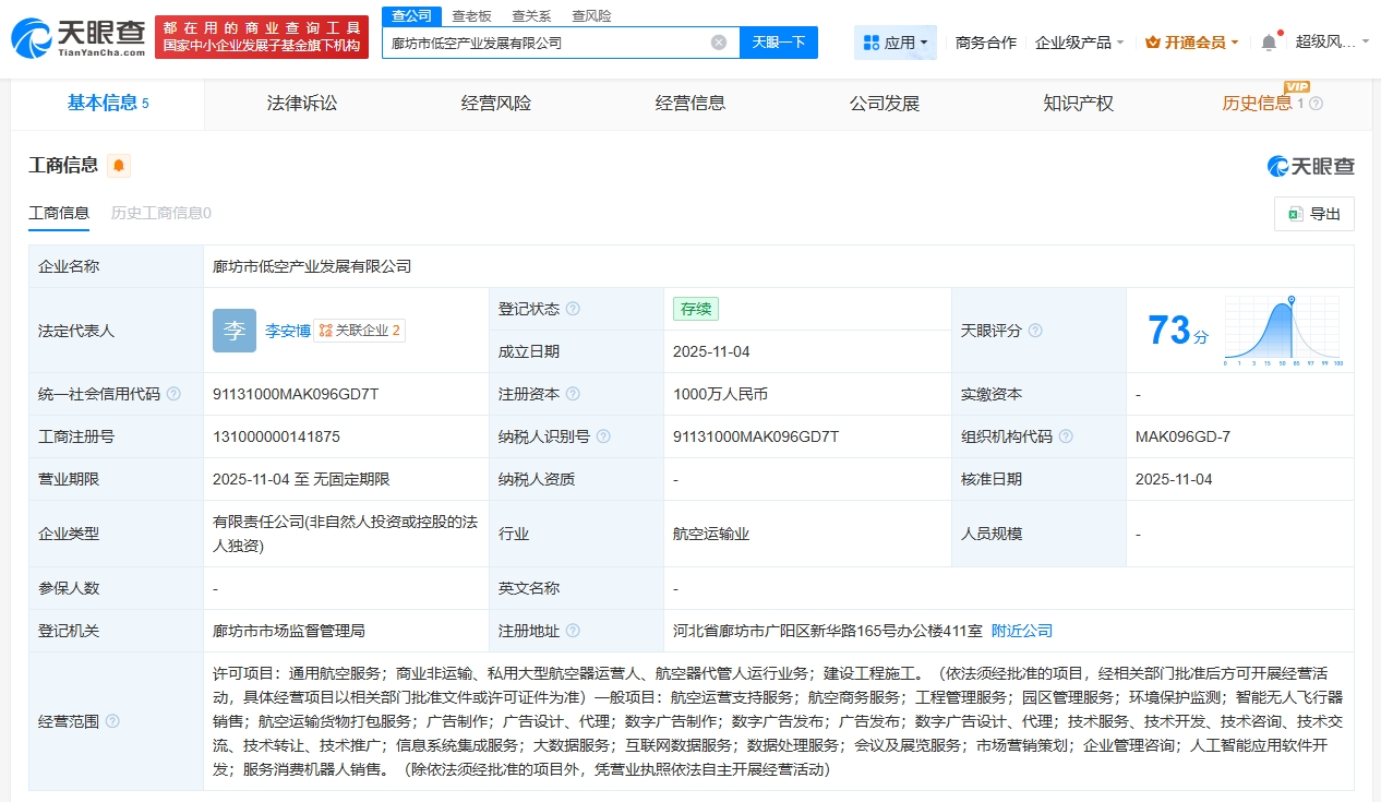 雷达财经讯,天眼查App显示,近日,廊坊市低空产业发展有限公司成立,法定代表人为李安博,注册资本1000万人民币,经营范围包括通用航空服务,商业非运输、私用大型航空器运营人、航空器代管人运行业务,建设工程施工等。股东信息显示,该公司由廊坊市投资控股集团有限公司全资持股。
