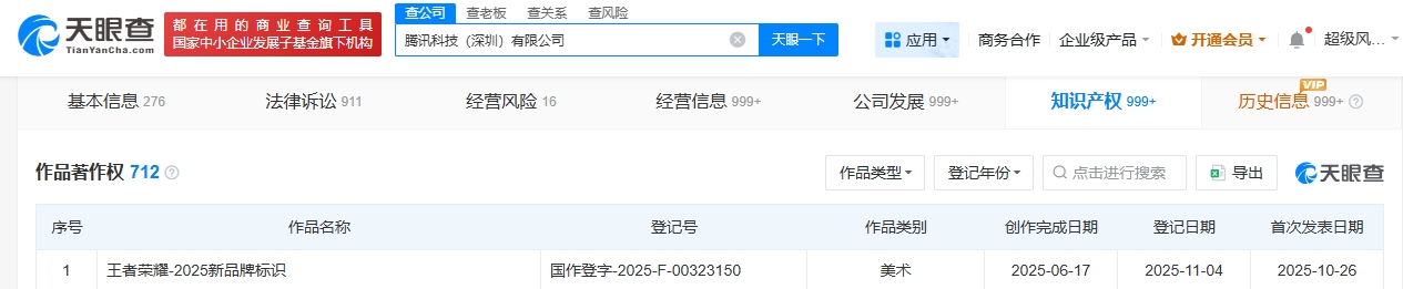 雷达财经讯,天眼查知识产权信息显示,近日,腾讯科技(深圳)有限公司登记“王者荣耀-2025新品牌标识”作品著作权,作品类别为美术。