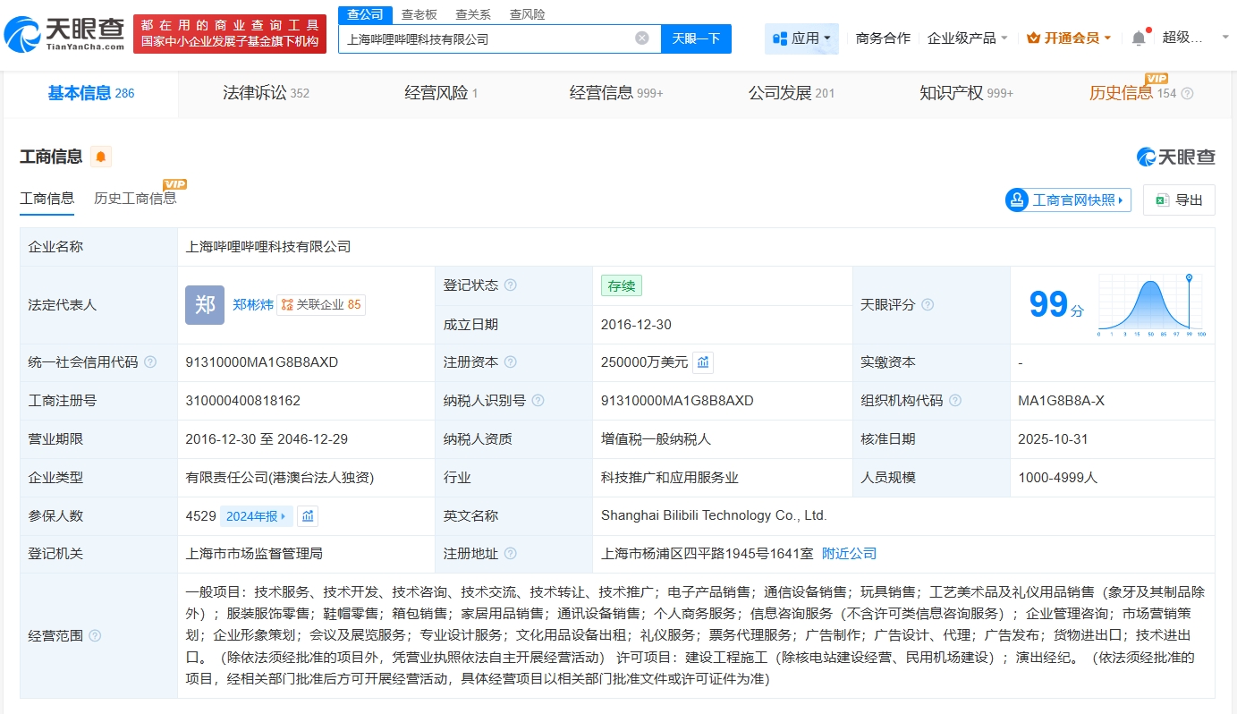 天眼查工商信息显示,近日,上海哔哩哔哩科技有限公司发生工商变更,陈睿卸任总经理、财务负责人…