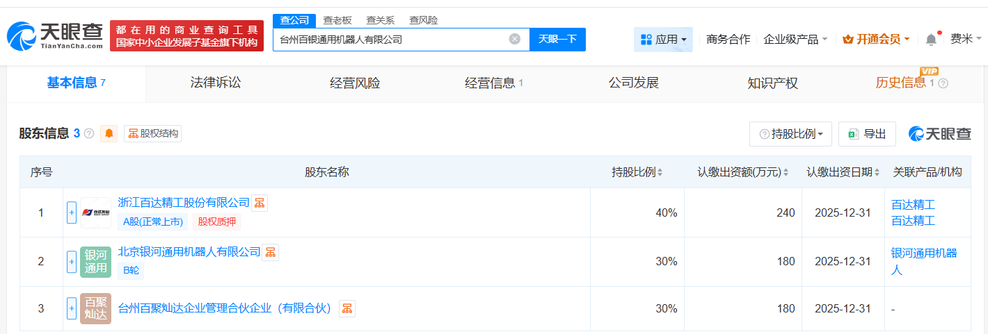 雷达财经讯,天眼查App显示,近日,台州百银通用机器人有限公司成立,法定代表人为张启斌,注册资本600万人民币,经营范围包括工业机器人制造、工业机器人销售、服务消费机器人制造等,由百达精工(603331)、北京银河通用机器人有限公司、台州百聚灿达企业管理合伙企业(有限合伙)共同持股。