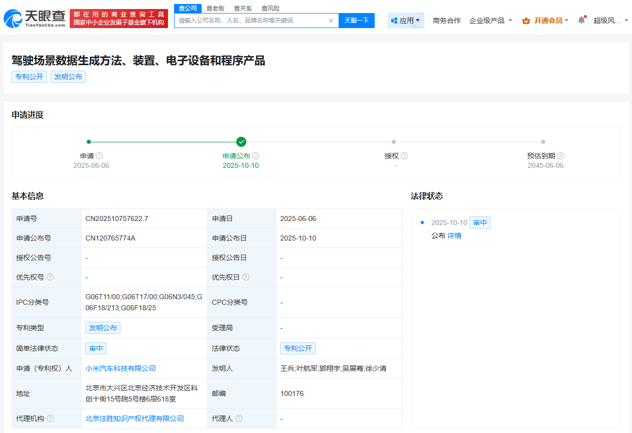 雷达财经讯,天眼查App显示,10月10日,小米汽车科技有限公司申请的“驾驶场景数据生成方法、装置、电子设备和程序产品”专利公布。