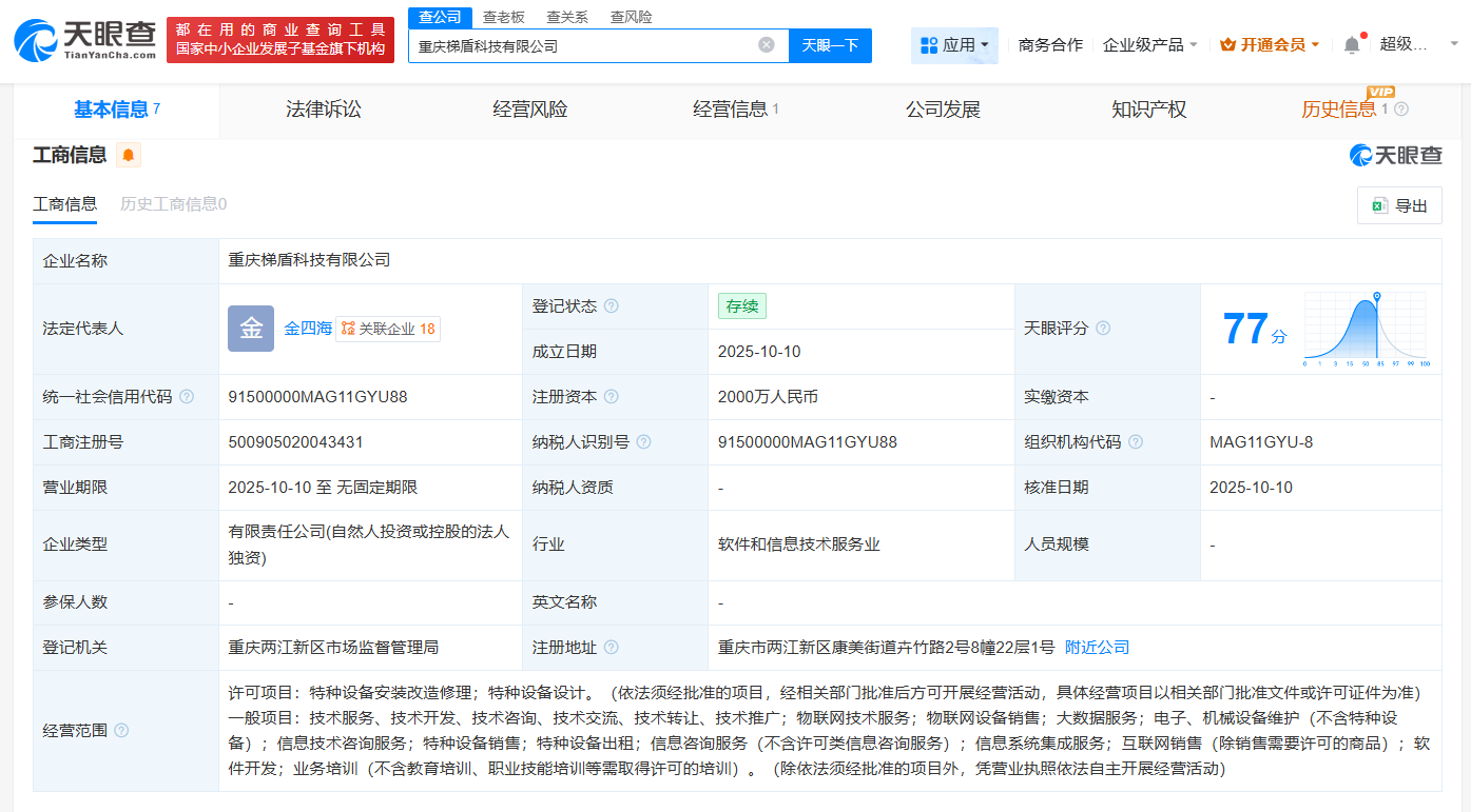 雷达财经讯,天眼查App显示,近日,重庆梯盾科技有限公司成立,法定代表人为金四海,注册资本2000万人民币,经营范围包括特种设备安装改造修理、特种设备设计、大数据服务、特种设备出租等。股东信息显示,该公司由重庆啄木鸟网络科技有限公司全资持股。