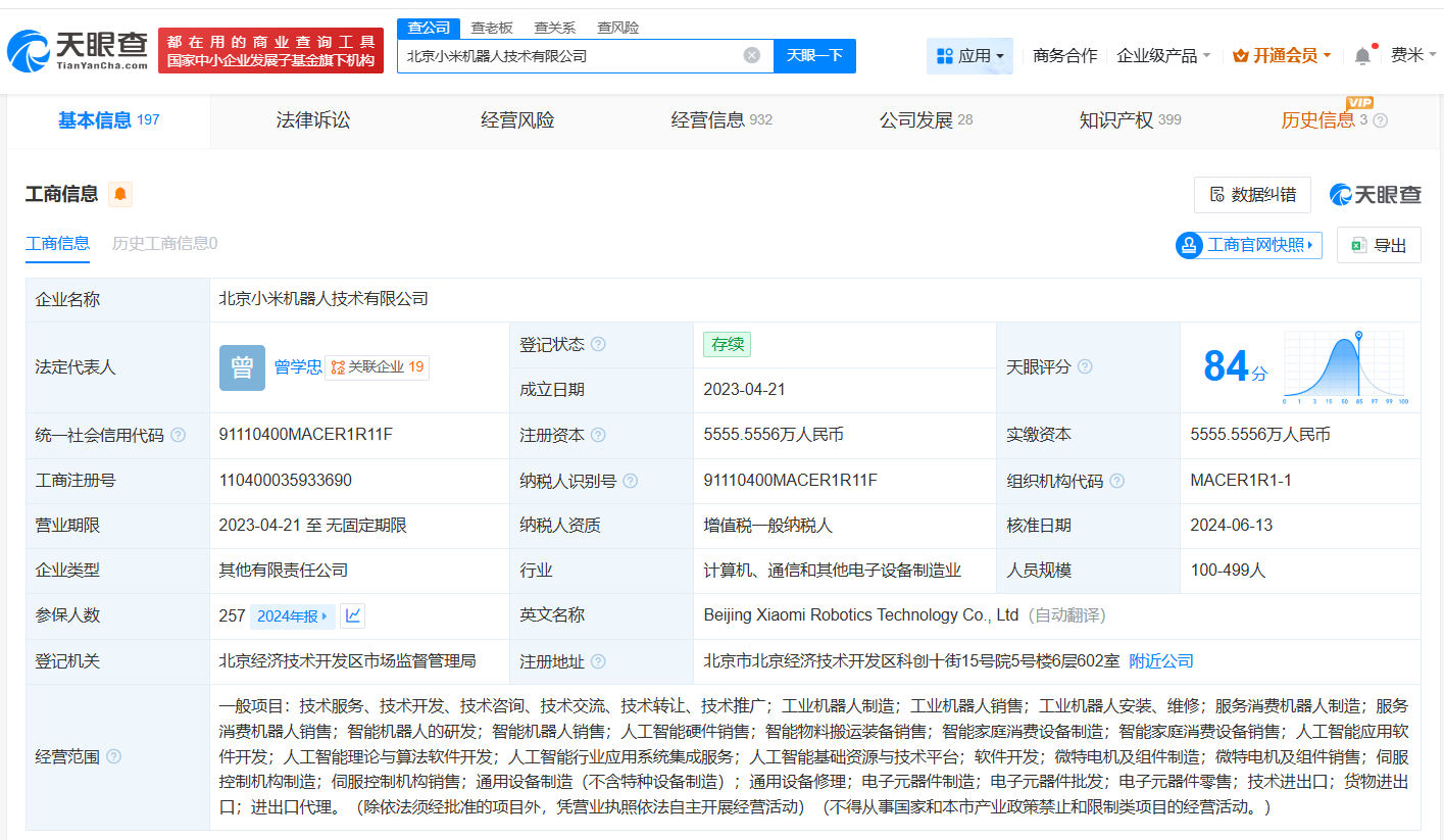 该公司成立于2023年4月,法定代表人为曾学忠,注册资本约5556万人民币,经营范围包括工业机器人制造、工业机器人销售、服务消费机器人制造等,由北京小米智能科技有限公司、北京屹唐创欣创业投资中心(有限合伙)共同持股。