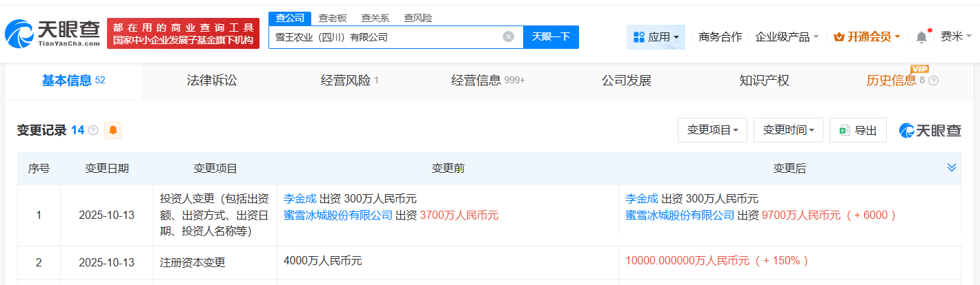 雷达财经讯,天眼查App显示,近日,雪王农业(四川)有限公司发生工商变更,注册资本由4000万人民币增至1亿人民币,增幅150%。