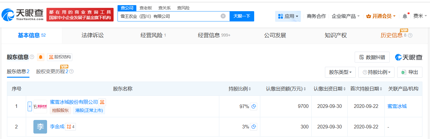 该公司成立于2020年9月,法定代表人为杜瀟,经营范围包括初级农产品收购、水果种植、食用农产品批发等,由蜜雪冰城股份有限公司、李金成共同持股。