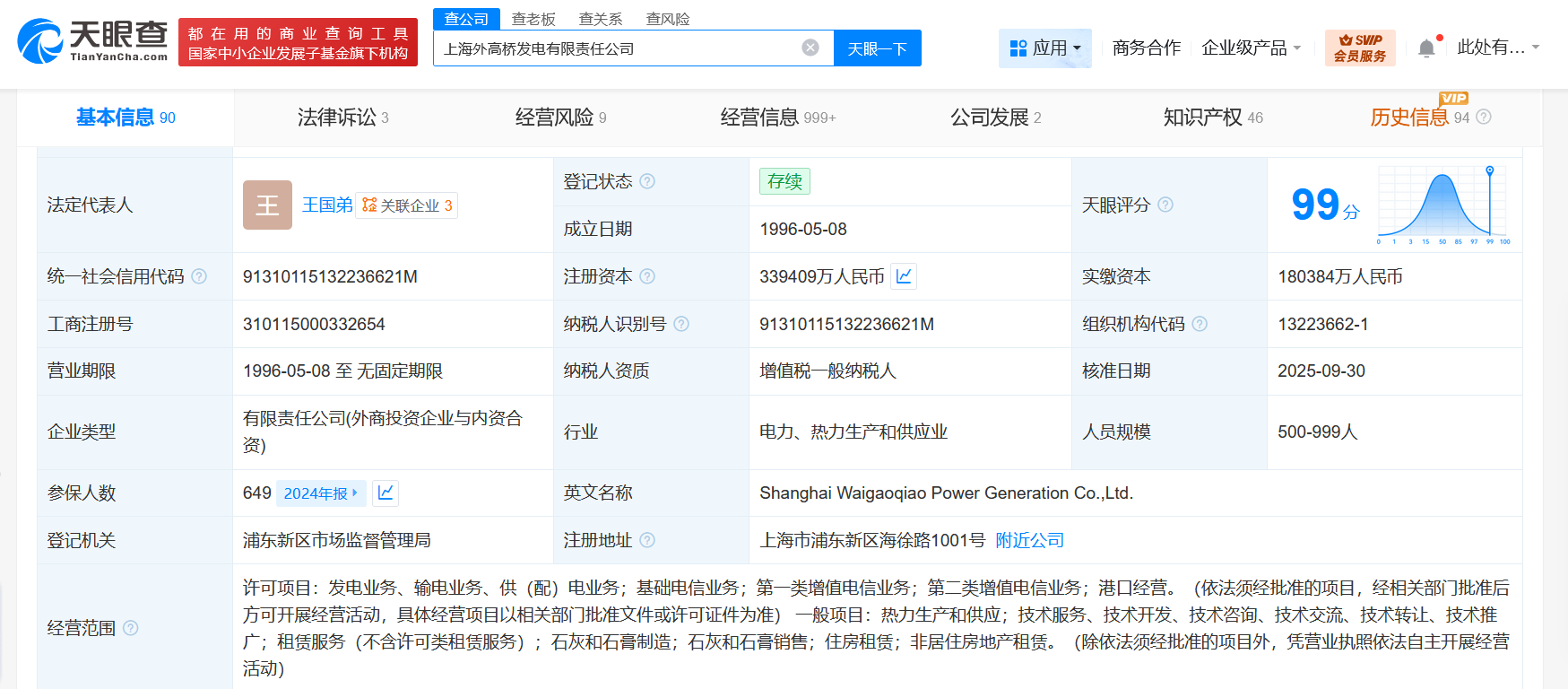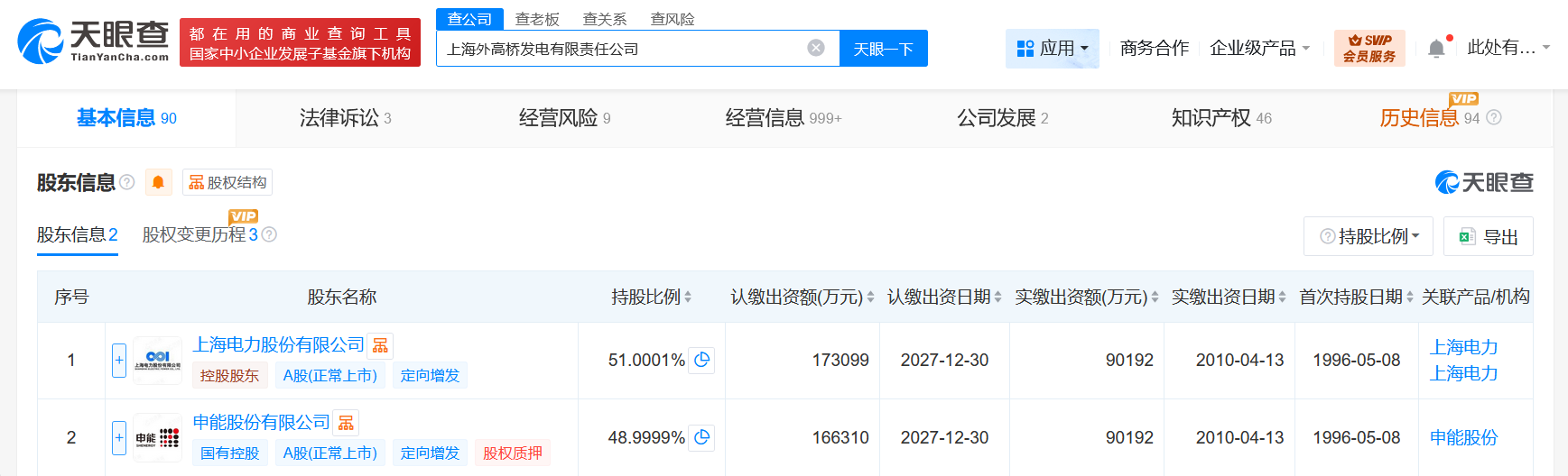 雷达财经讯,天眼查工商信息显示,近日,上海外高桥发电有限责任公司发生工商变更,注册资本由约18.04亿人民币增至约33.94亿人民币,增幅约88%。