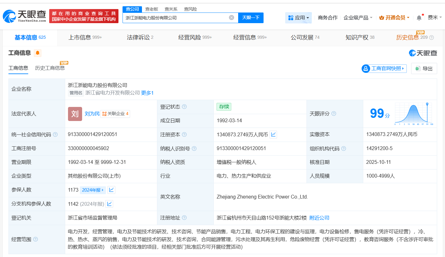雷达财经讯,天眼查App显示,近日,浙能电力(600023)发生工商变更,虞国平卸任法定代表人、董事长,由刘为民接任。