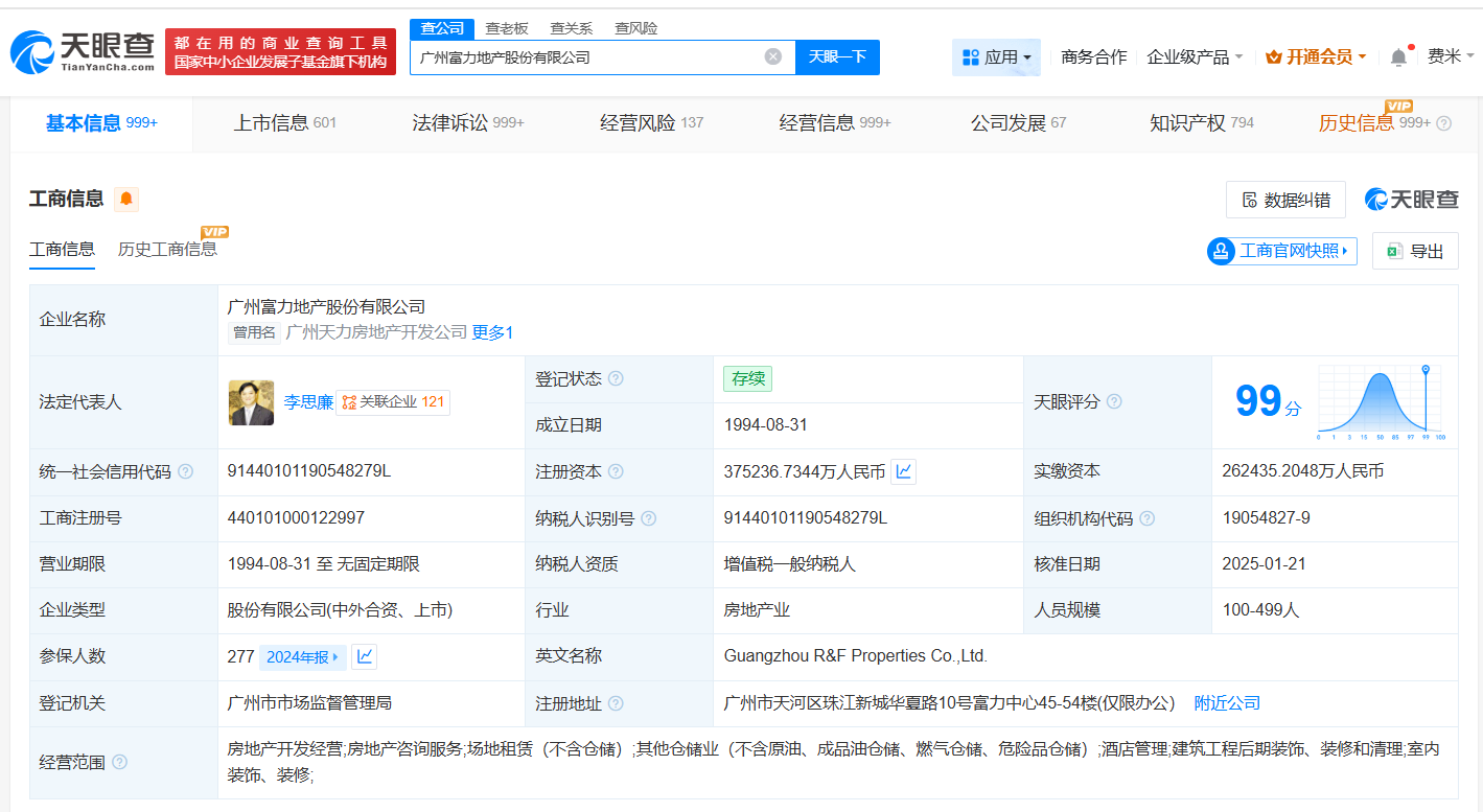 风险信息显示,广州富力地产股份有限公司现存90条被执行人信息,被执行总金额超163亿元。此外,该公司还存在多条限制消费令、失信被执行人(老赖)及终本案件信息。