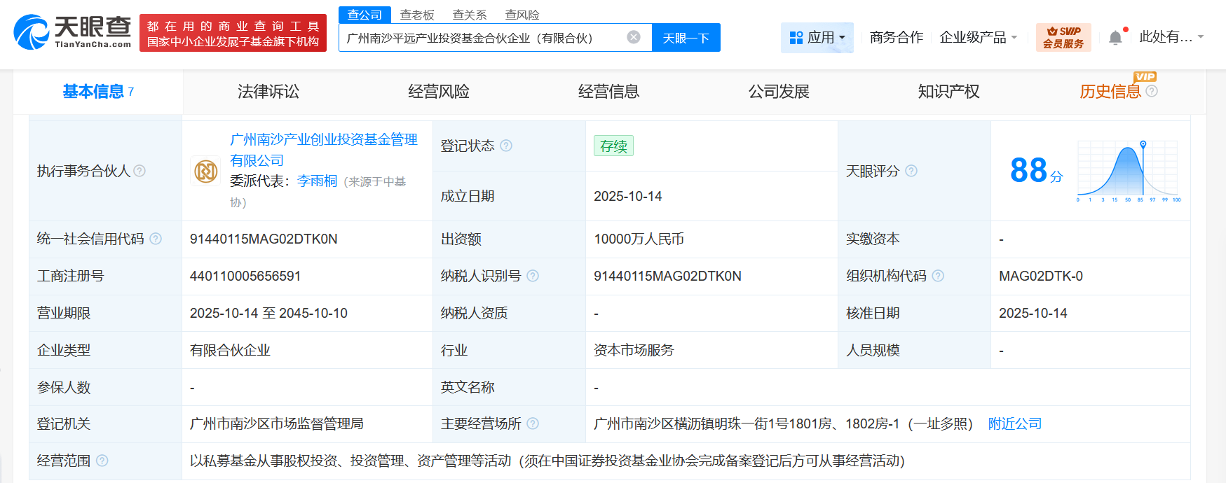 雷达财经讯,天眼查工商信息显示,近日,广州南沙平远产业投资基金合伙企业(有限合伙)成立,执行事务合伙人为广州南沙产业创业投资基金管理有限公司,出资额1亿人民币,经营范围含以私募基金从事股权投资、投资管理、资产管理等活动。合伙人信息显示,该基金由梅州平远致远产业投资发展有限公司、广州南沙人工同智创业投资合伙企业(有限合伙)、广州南沙产业创业投资基金管理有限公司共同持股。