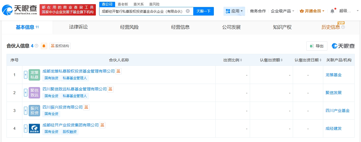 雷达财经讯,天眼查App显示,近日,成都经开智行私募股权投资基金合伙企业(有限合伙)成立,执行事务合伙人为四川聚信致远私募基金管理有限公司、成都龙雏私募股权投资基金管理有限公司,出资额约6亿人民币,经营范围为以私募基金从事股权投资、投资管理、资产管理等活动,以自有资金从事投资活动,信息咨询服务,社会经济咨询服务。合伙人信息显示,该基金由成都龙雏私募股权投资基金管理有限公司、四川聚信致远私募基金管理有限公司、四川振兴投资有限公司等共同出资。