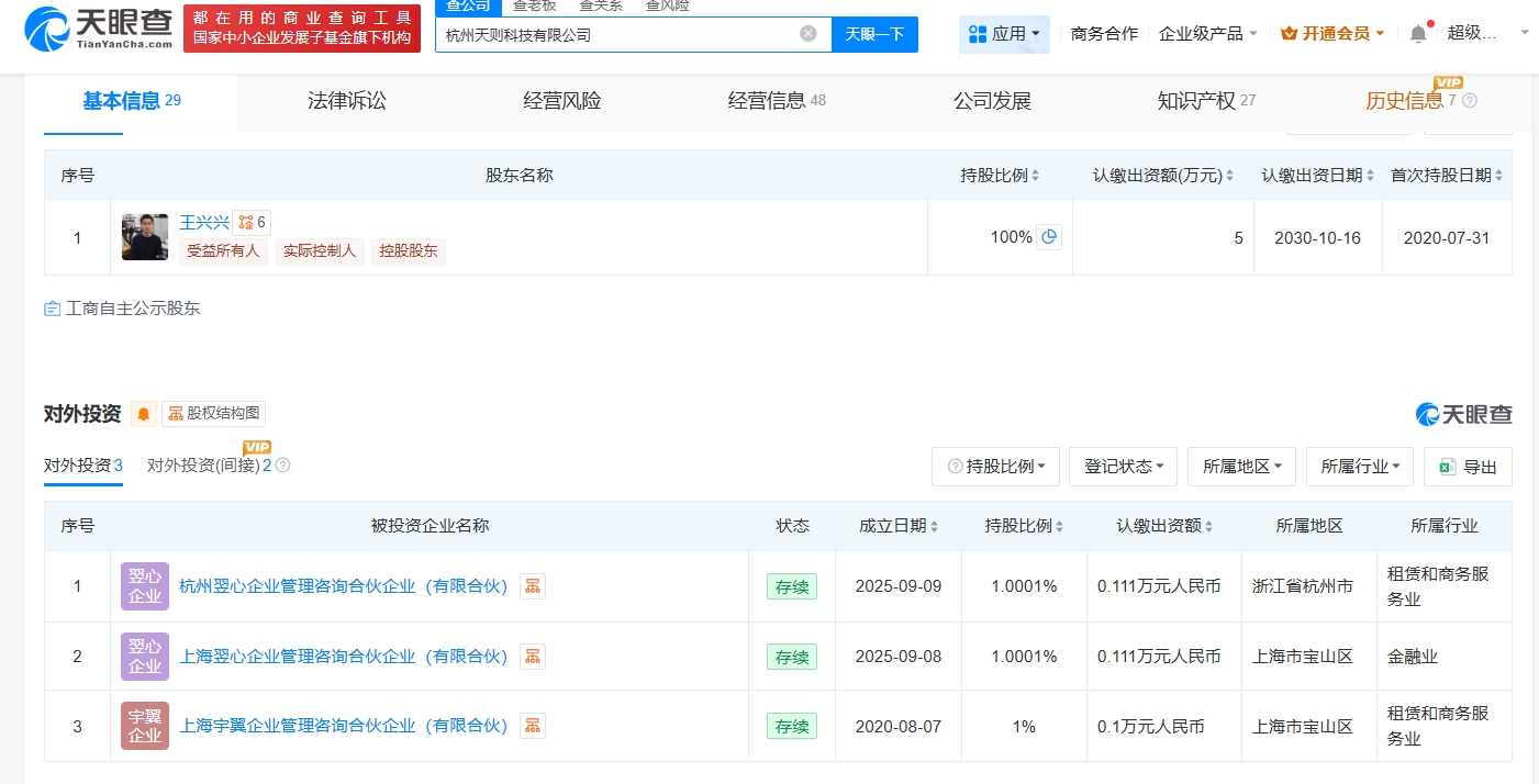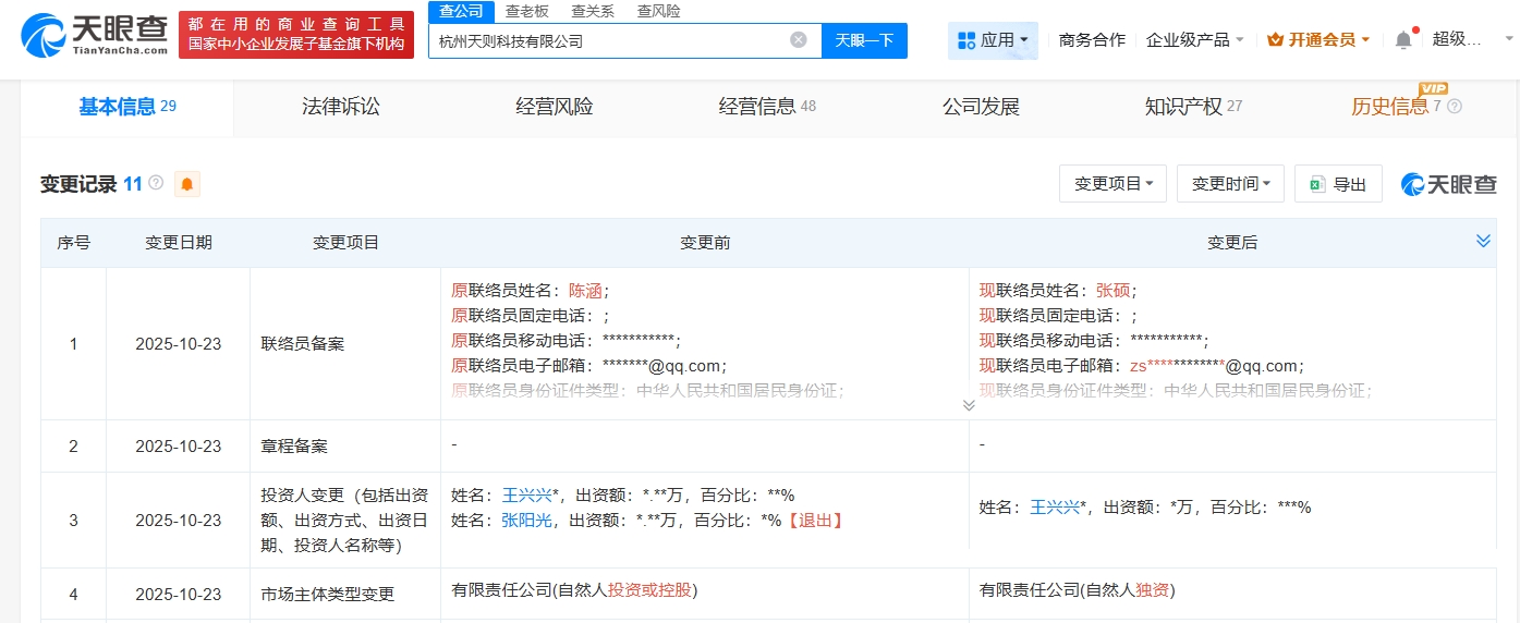 雷达财经讯,天眼查App显示,近日,杭州天则科技有限公司发生工商变更,原股东张阳光退出,王兴兴持股比例由99%变更为100%。