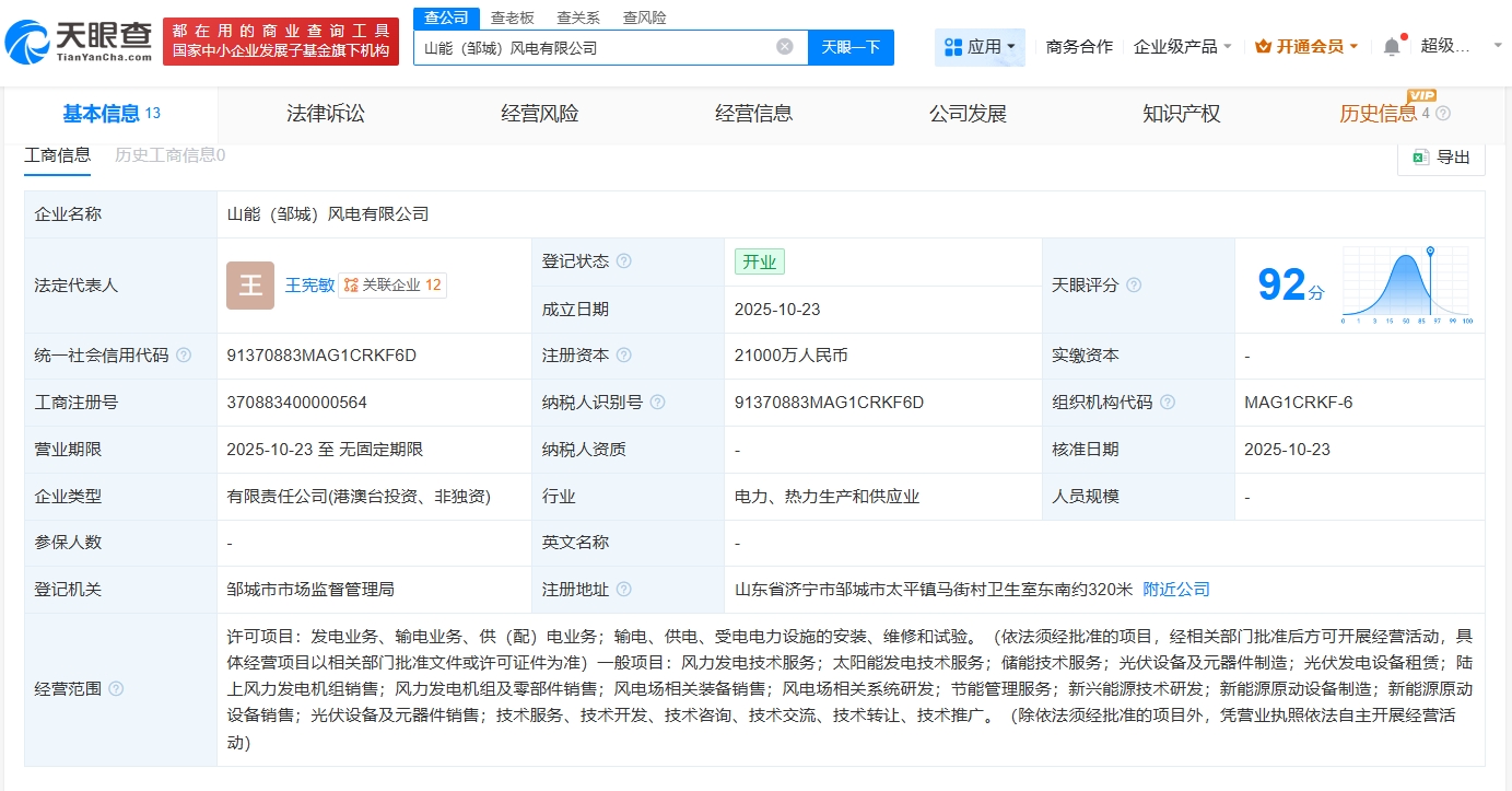 雷达财经讯,天眼查App显示,近日,山能(邹城)风电有限公司成立,法定代表人为王宪敏,注册资本2.1亿人民币,经营范围包括风力发电技术服务、太阳能发电技术服务、储能技术服务、光伏设备及元器件制造等。股东信息显示,该公司由山东能源集团新能源集团有限公司、兖矿能源(600188)、兖煤国际(控股)有限公司共同持股。