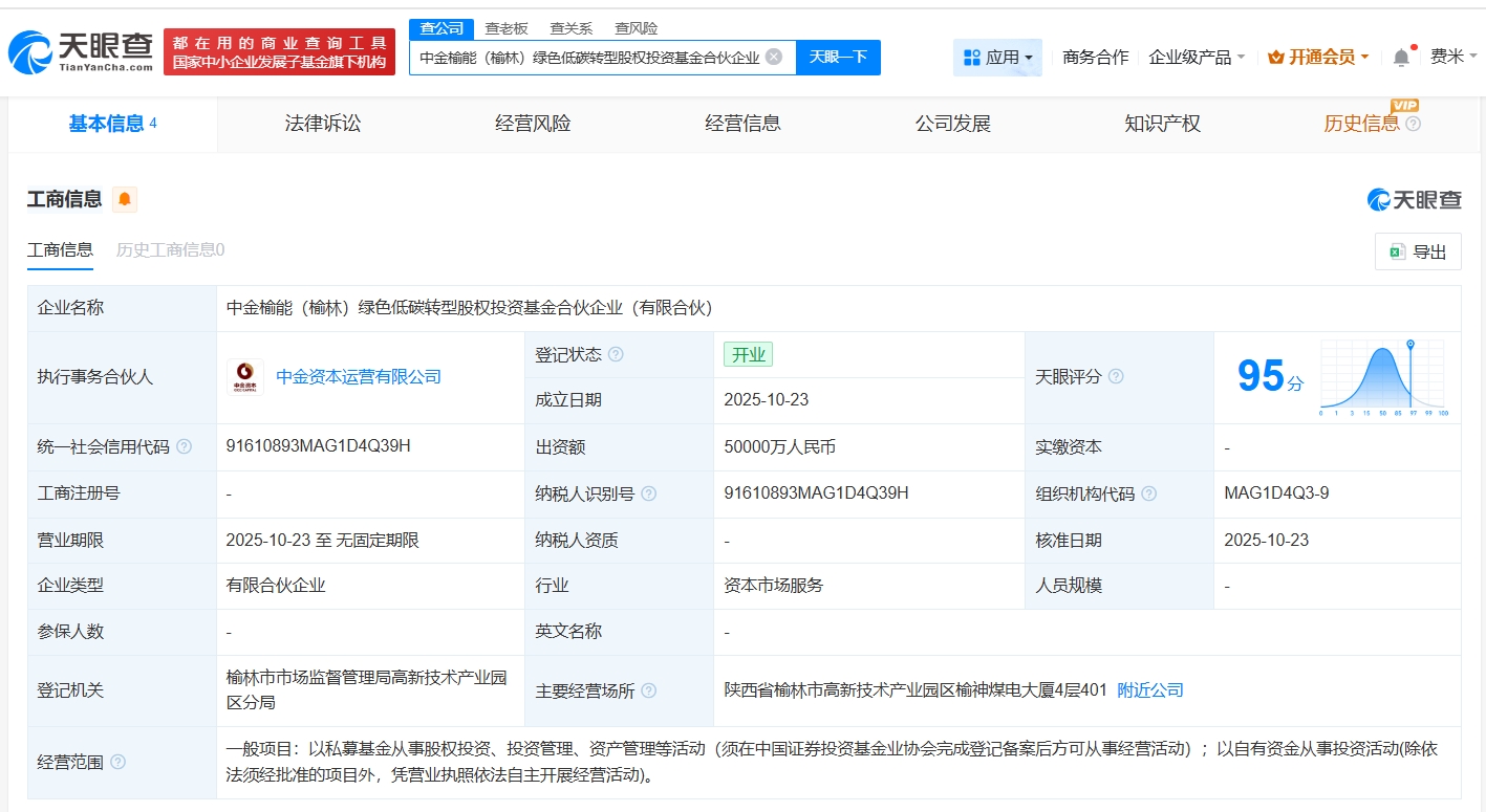 雷达财经讯,天眼查App显示,近日,中金榆能(榆林)绿色低碳转型股权投资基金合伙企业(有限合伙)成立,执行事务合伙人为中金资本运营有限公司,出资额5亿人民币,经营范围为以私募基金从事股权投资、投资管理、资产管理等活动,以自有资金从事投资活动,由陕西榆林能源集团有限公司、中金资本运营有限公司共同出资。